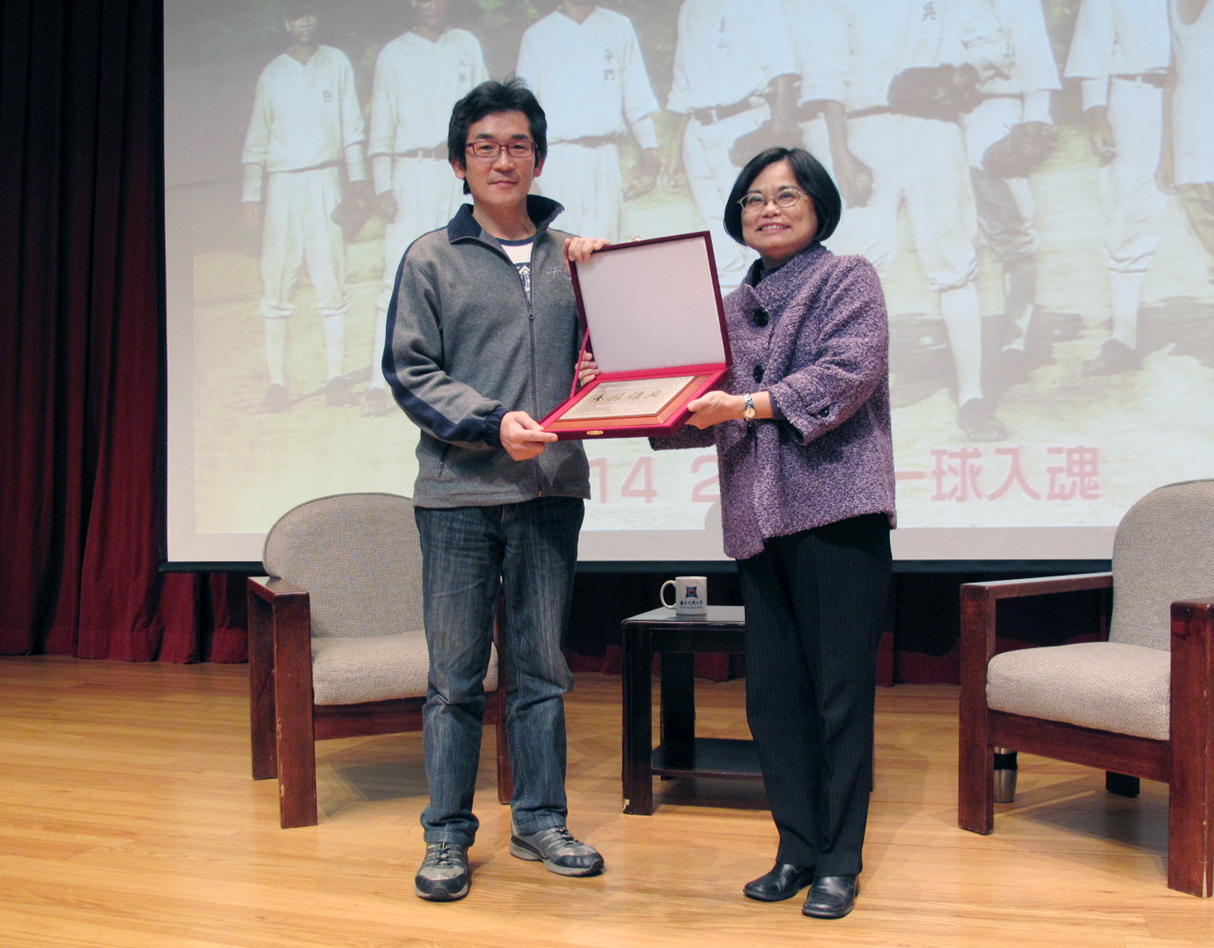 興大文學院陳淑卿院長(右)頒發惠蓀講座紀念牌給魏德聖。