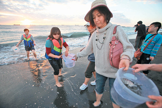 看到海濤法師將在旗津放生5萬5千隻烏格(15到18公分大),一群學生認為用金錢購買生命不等於行善,以臉書串連,昨天從各地前往旗津,拉起自製海報,並沿街發放拒絕商業放生貼紙,希望爭取到認同。