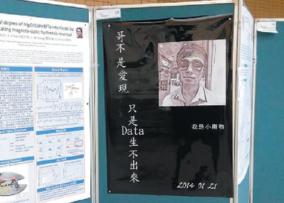 更有網友化身偵探,從兩旁張貼的海報、主辦單位公布的與會論文目錄中,推得這位「勇者」正是在中山大學物理所擔任助教的李姓研究生,研究主題是關於氮化釓薄膜的磁性與電性探討而根據現場參與的學生描述,其實正式發表前,這位研究生就換下了海報,拿出真正的研究成果和Data,讓不少人直說「太可惜了,真想看看教授們的反應!」