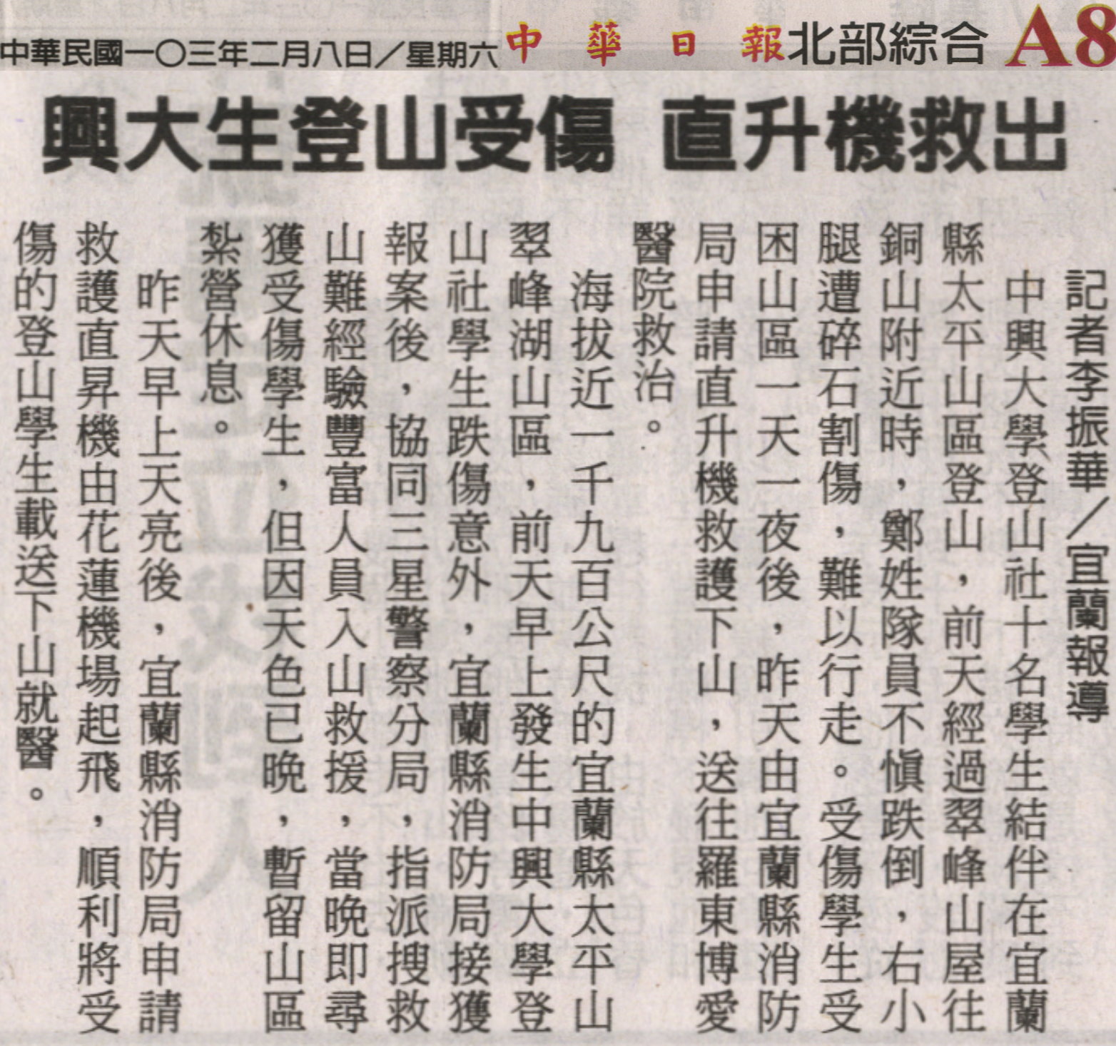 【媒體報導】興大生登山受傷 直升機救出