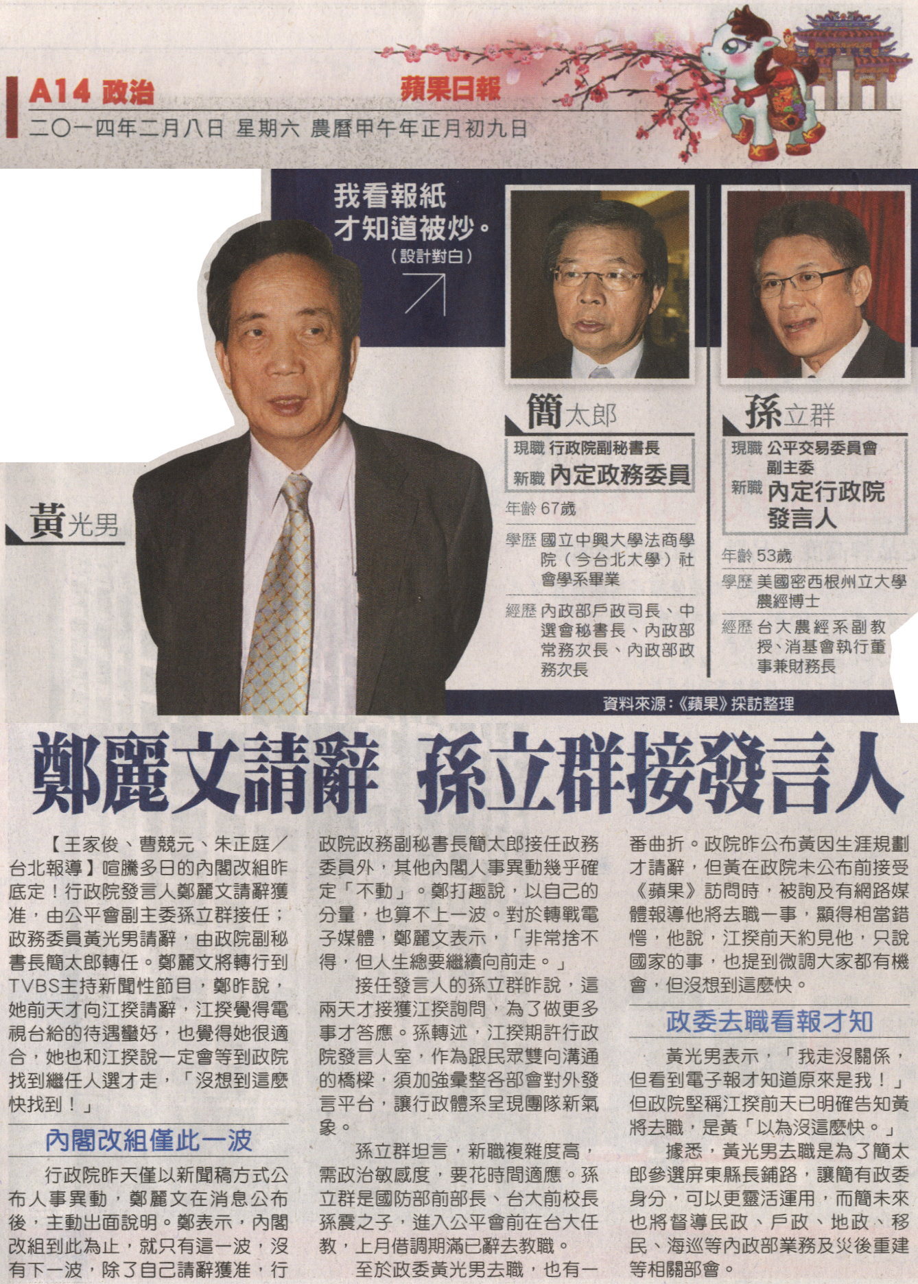 稿源:2014-02-08/蘋果日報/A14/政治/王家俊、曹競元、朱正庭/台北