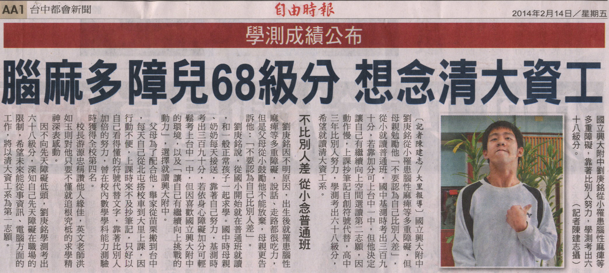 國立興大附中劉庚銘從小罹患腦性麻痺等多重障礙,但母親勉勵他「不要認為自己比別人差」,從小就讀普通班,國中基測時考出三百九十分,若靠加分可上台中一中,但他決定讓自己有繼續向上空間選讀第二志願,因動作慢,上課抄筆記自創符號代替,高中三年比別人努力,學測考出六十八級分,希望就讀清大資工系。