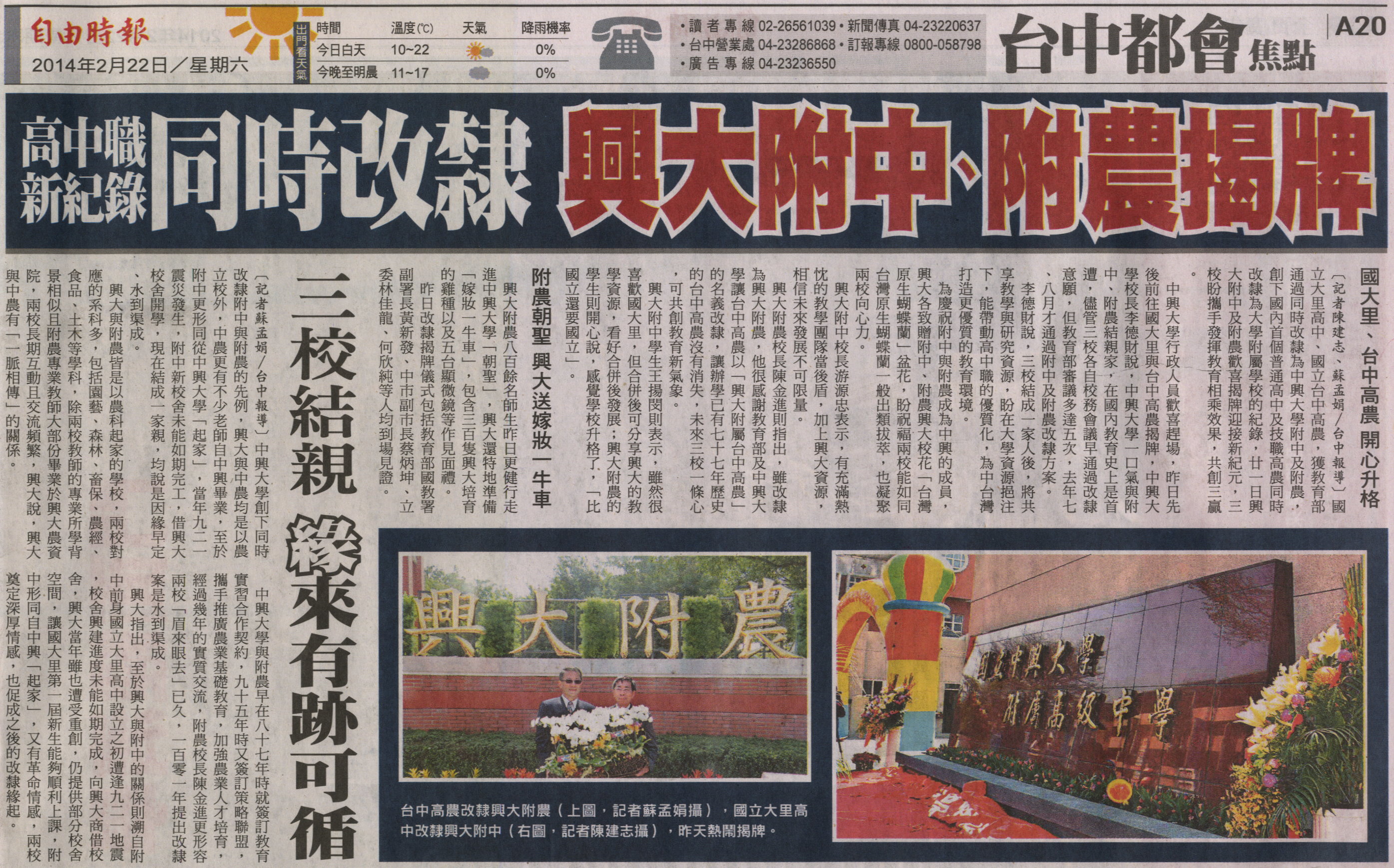 國立大里高中、國立台中高農,獲教育部通過同時改隸為中興大學附中及附農,創下國內首個普通高中及技職高農同時改隸為大學附屬學校的紀錄,廿一日興大附中及附農歡喜揭牌迎接新紀元,三校盼攜手發揮教育相乘效果,共創三贏。