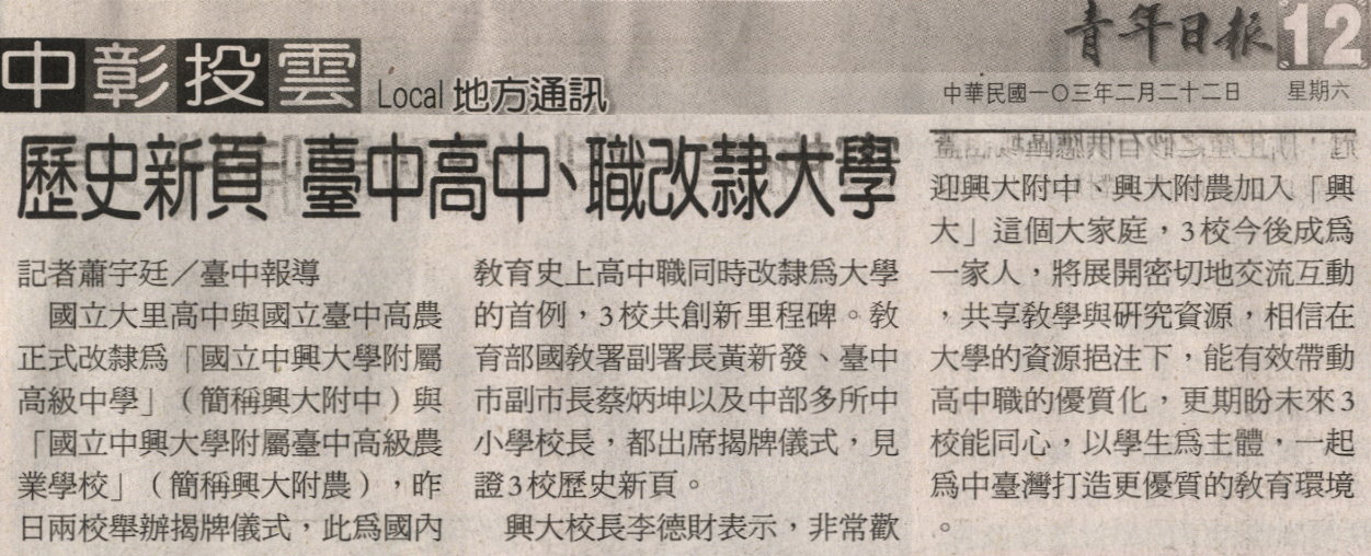 【媒體報導】歷史新頁 臺中高中、職改隸大學