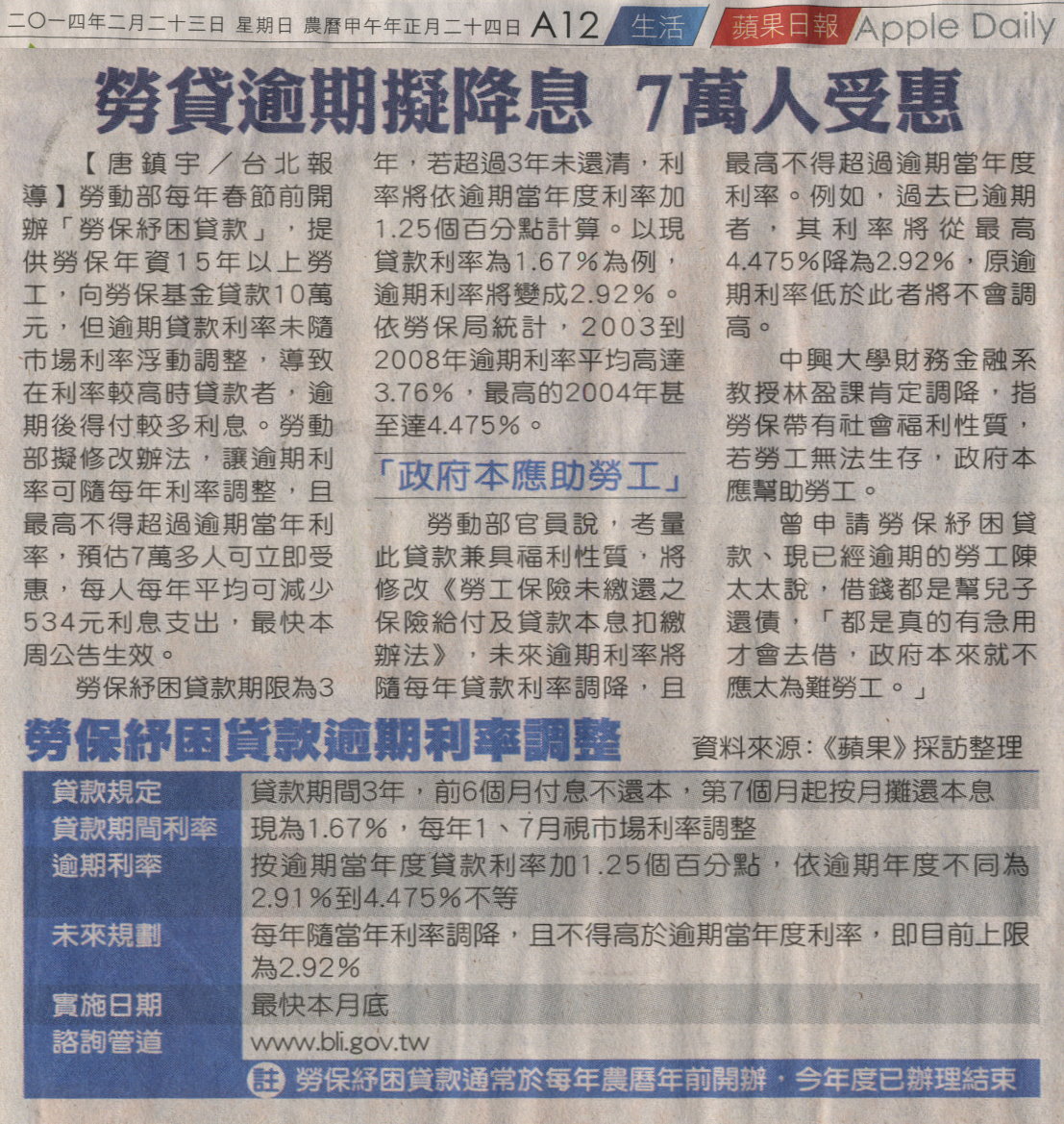 稿源:2014-02-23/蘋果日報/A12/生活/唐鎮宇/台北