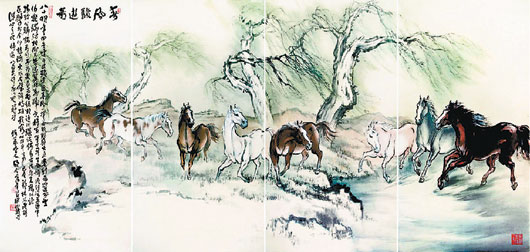 這次展出作品,從大自然風景、動物、到鄉村景致完整呈現,其中「春風駿遊」中,可見馬匹奔馳在草原,每匹馬匹神情唯妙唯肖,是歐豪年許自己「八旬無心」的自壽作品。