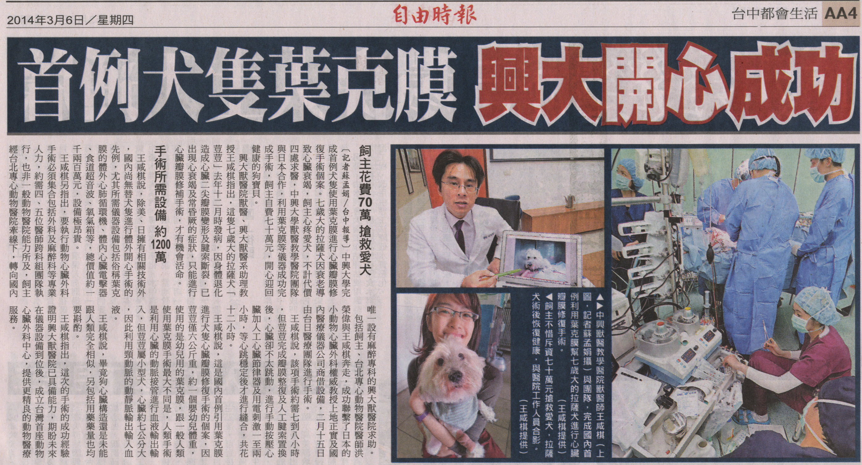中興大學完成首例犬隻使用葉克膜進行心臟瓣膜修復手術個案。七歲大的拉薩犬因衰老導致心臟衰竭,飼主心疼愛犬,不計代價四處求醫,中興大學獸醫教學醫院團隊與日本合作,利用葉克膜等儀器成功完成手術,飼主自費七十萬元,開心迎回健康的狗寶貝。