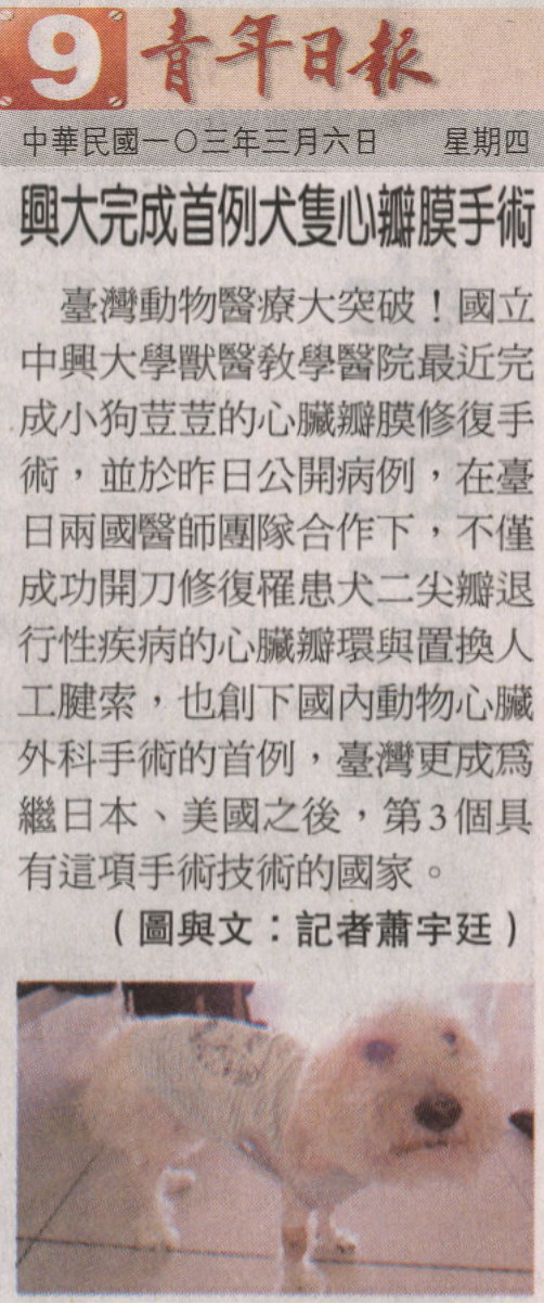 【媒體報導】興大完成首例犬隻心瓣膜手術