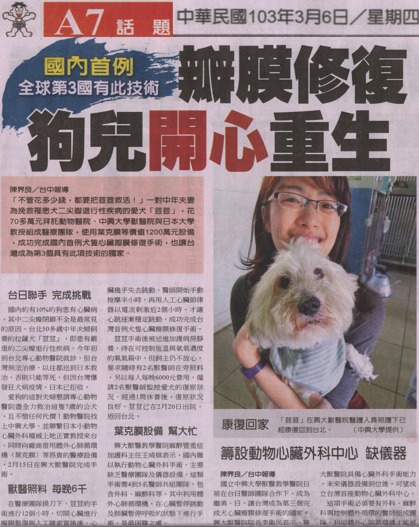 「不管花多少錢,都要把荳荳救活!」一對中年夫妻為挽救罹患犬 二尖瓣退行性疾病的愛犬「荳荳」,花70多萬元拜託動物醫院、中興大學獸醫院與日本大學教授組成醫療團隊,使用葉克膜等價值1200萬 元設備,成功完成國內首例犬隻心臟瓣膜修復手術,也讓台灣成為第 3個具有此項技術的國家。