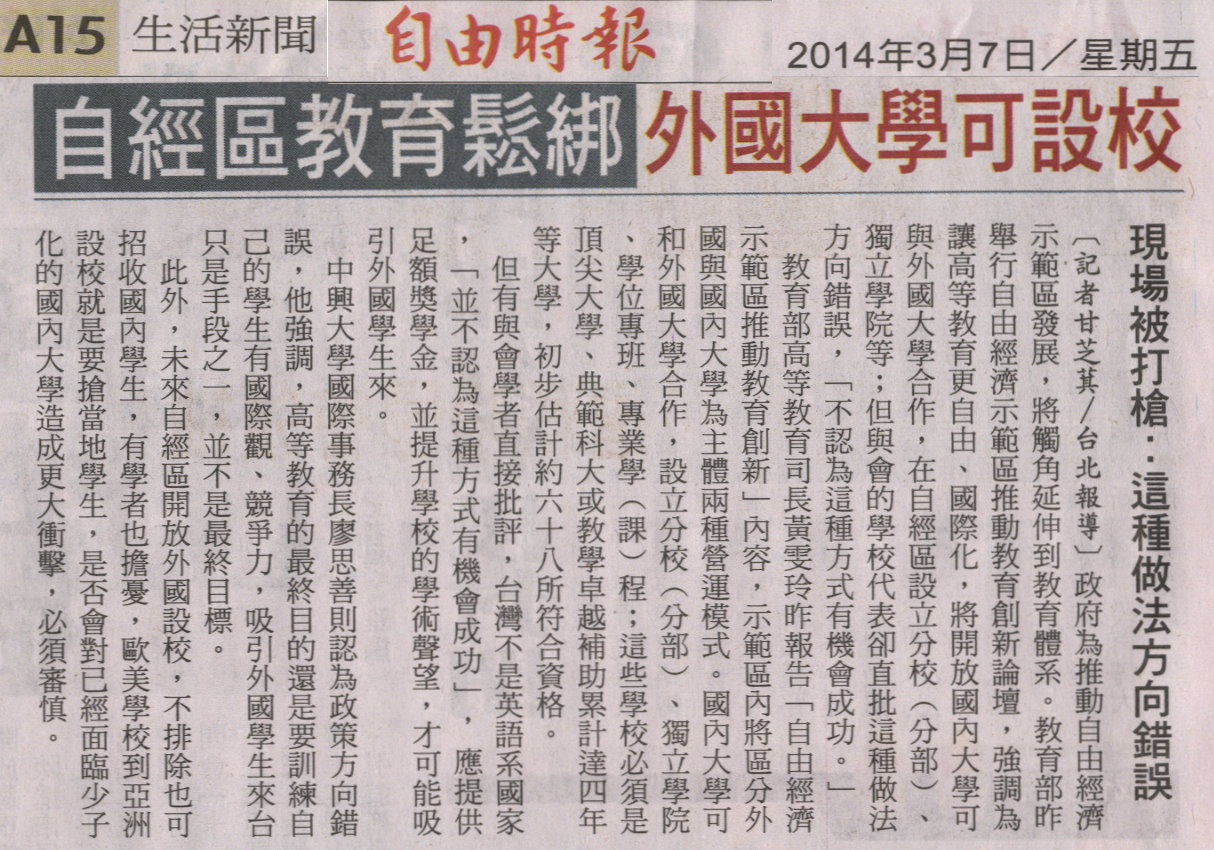 【媒體報導】自經區教育鬆綁 外國大學可設校