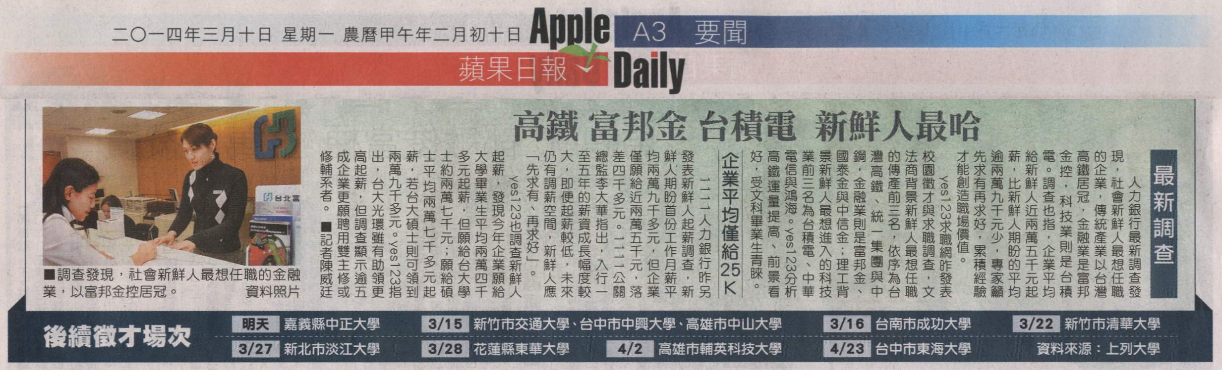 yes123求職網昨發表校園徵才與求職調查,文法商背景新鮮人最想任職的傳產前三名,依序為台灣高鐵、統一集團與中鋼,金融業則是富邦金、國泰金與中信金;理工背景新鮮人最想進入的科技業前三名為台積電、中華電信與鴻海。yes123分析高鐵運量提高、前景看好,受文科畢業生青睞。