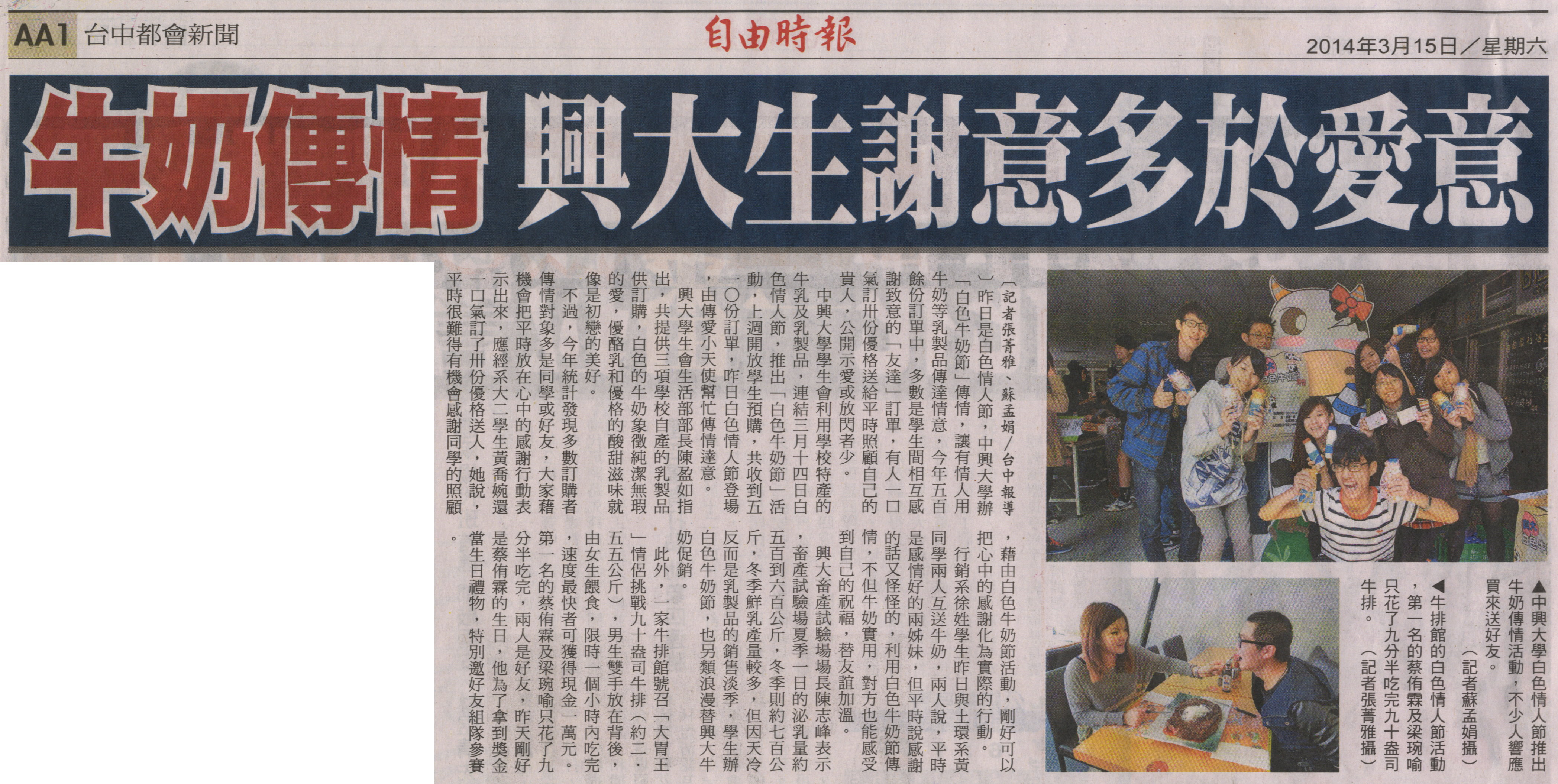 中興大學學生會利用學校特產的牛乳及乳製品,連結三月十四日白色情人節,推出「白色牛奶節」活動,上週開放學生預購,共收到五一○份訂單,昨日白色情人節登場,由傳愛小天使幫忙傳情達意。