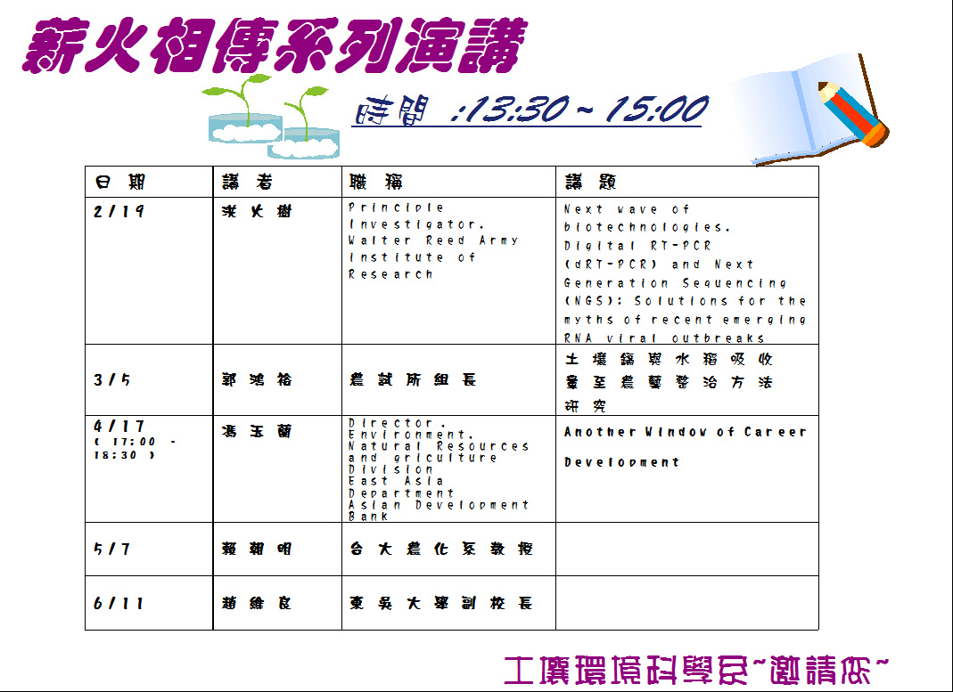 ★土環系薪火相傳系列演講~103年4月17日下午17:00~18:30農環大樓10樓土環系演講廳(10D07室)★