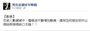 反服貿抗議持續在立法院進行,而為了確保反服貿活動可以堅持到星期五,發起活動的黑色島國青年陣線,今早10時在臉書發布動員,「目前人數遞減中,警察卻不斷增加動員,請有空的朋友到中山南路與濟南路口支援!!」
