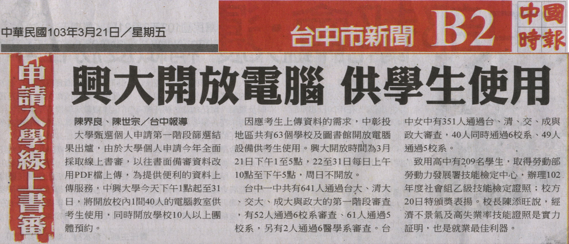 【媒體報導】申請入學線上書審 興大開放電腦 供學生使用