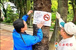 癮君子注意了!全縣三十八處列管公園綠地,四月一日起將禁菸,埔里鎮公所二十四日加派人員在鎮內公園綠地張貼禁菸公告,違者最高可處一萬元罰鍰。