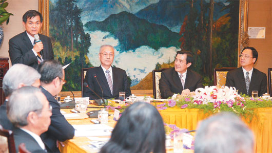 馬總統(右二)昨晚與十一所大學校長座談,行政院長江宜樺(右一)、副總統吳敦義(右三)陪同出席。(中央社) |