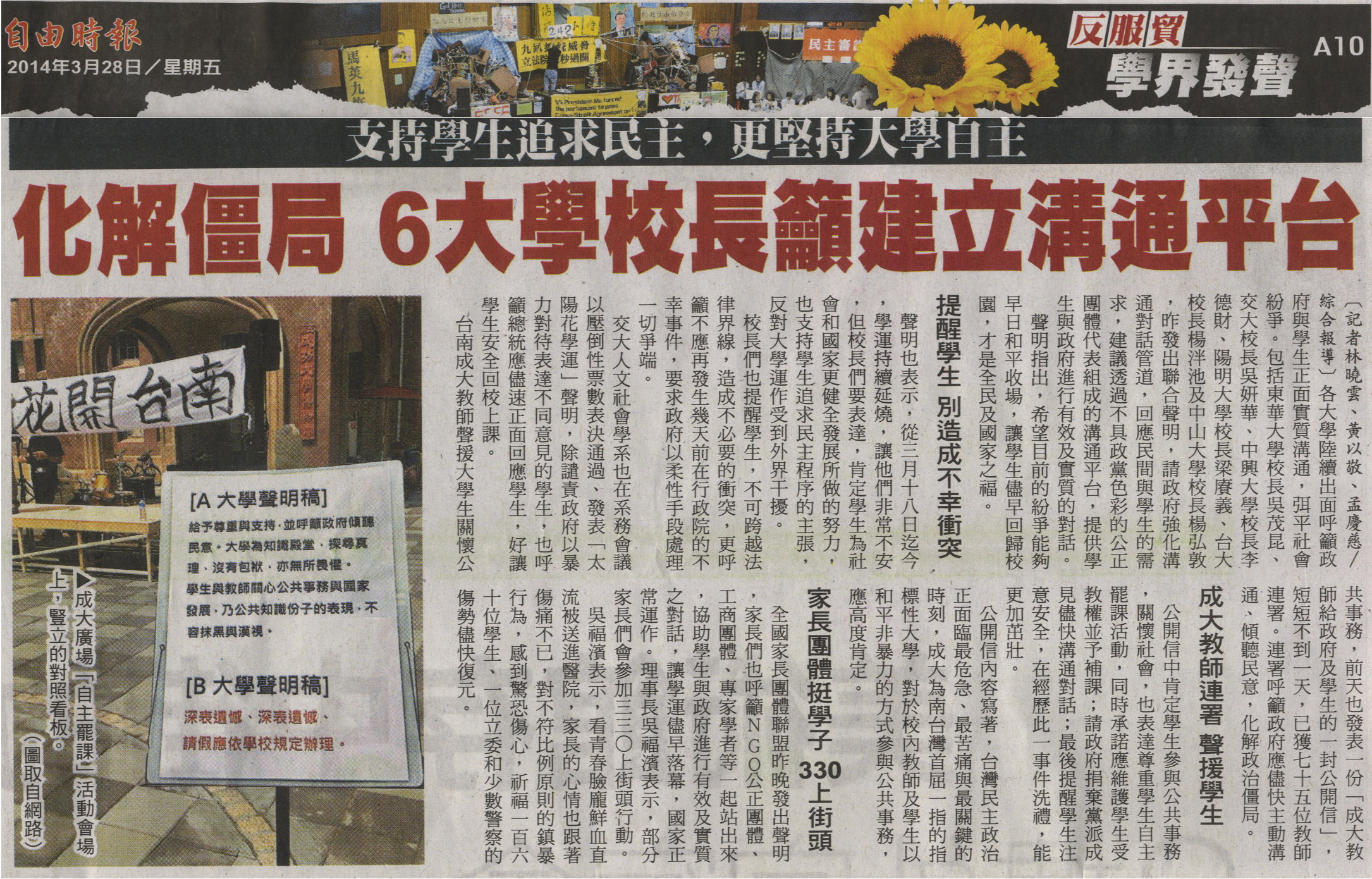 各大學陸續出面呼籲政府與學生正面實質溝通,弭平社會紛爭。包括東華大學校長吳茂昆、交大校長吳妍華、中興大學校長李德財、陽明大學校長梁賡義、台大校長楊泮池及中山大學校長楊弘敦,昨發出聯合聲明,請政府強化溝通對話管道,回應民間與學生的需求,建議透過不具政黨色彩的公正團體代表組成的溝通平台,提供學生與政府進行有效及實質的對話。