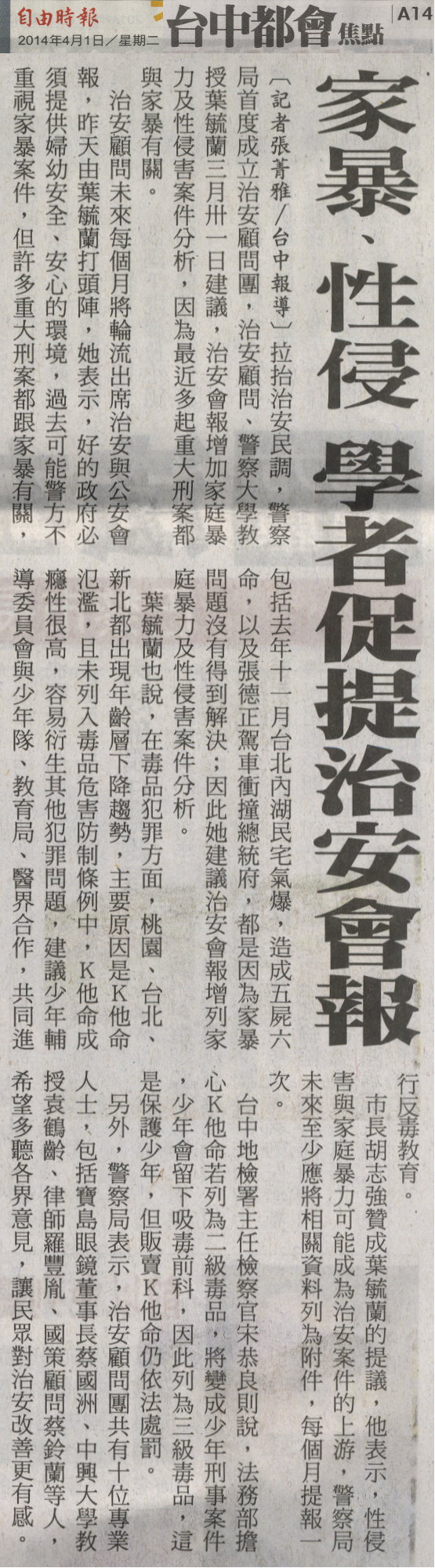 拉抬治安民調,警察局首度成立治安顧問團,治安顧問、警察大學教授葉毓蘭三月卅一日建議,治安會報增加家庭暴力及性侵害案件分析,因為最近多起重大刑案都與家暴有關。