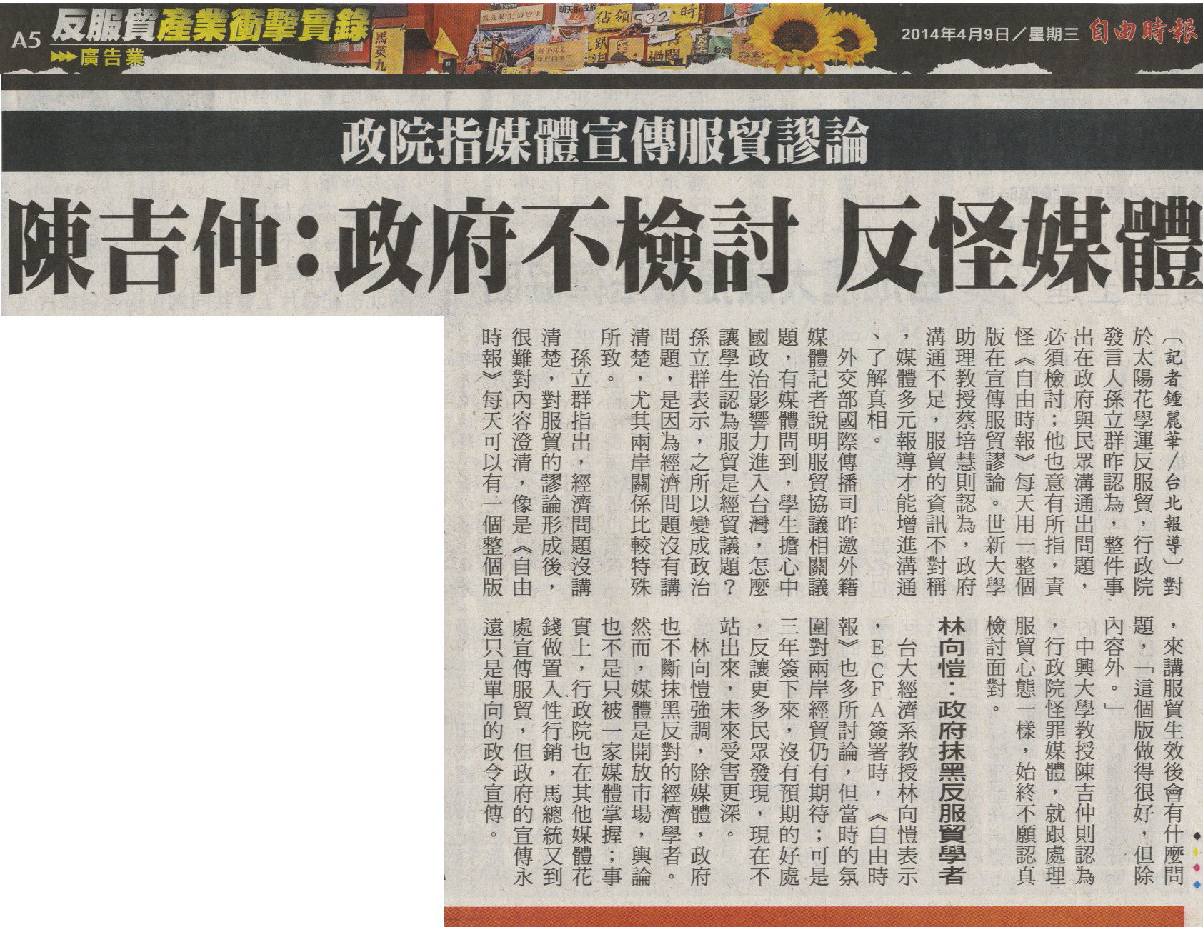 對於太陽花學運反服貿,行政院發言人孫立群昨認為,整件事出在政府與民眾溝通出問題,必須檢討;他也意有所指,責怪《自由時報》每天用一整個版在宣傳服貿謬論。世新大學助理教授蔡培慧則認為,政府溝通不足,服貿的資訊不對稱,媒體多元報導才能增進溝通、了解真相。