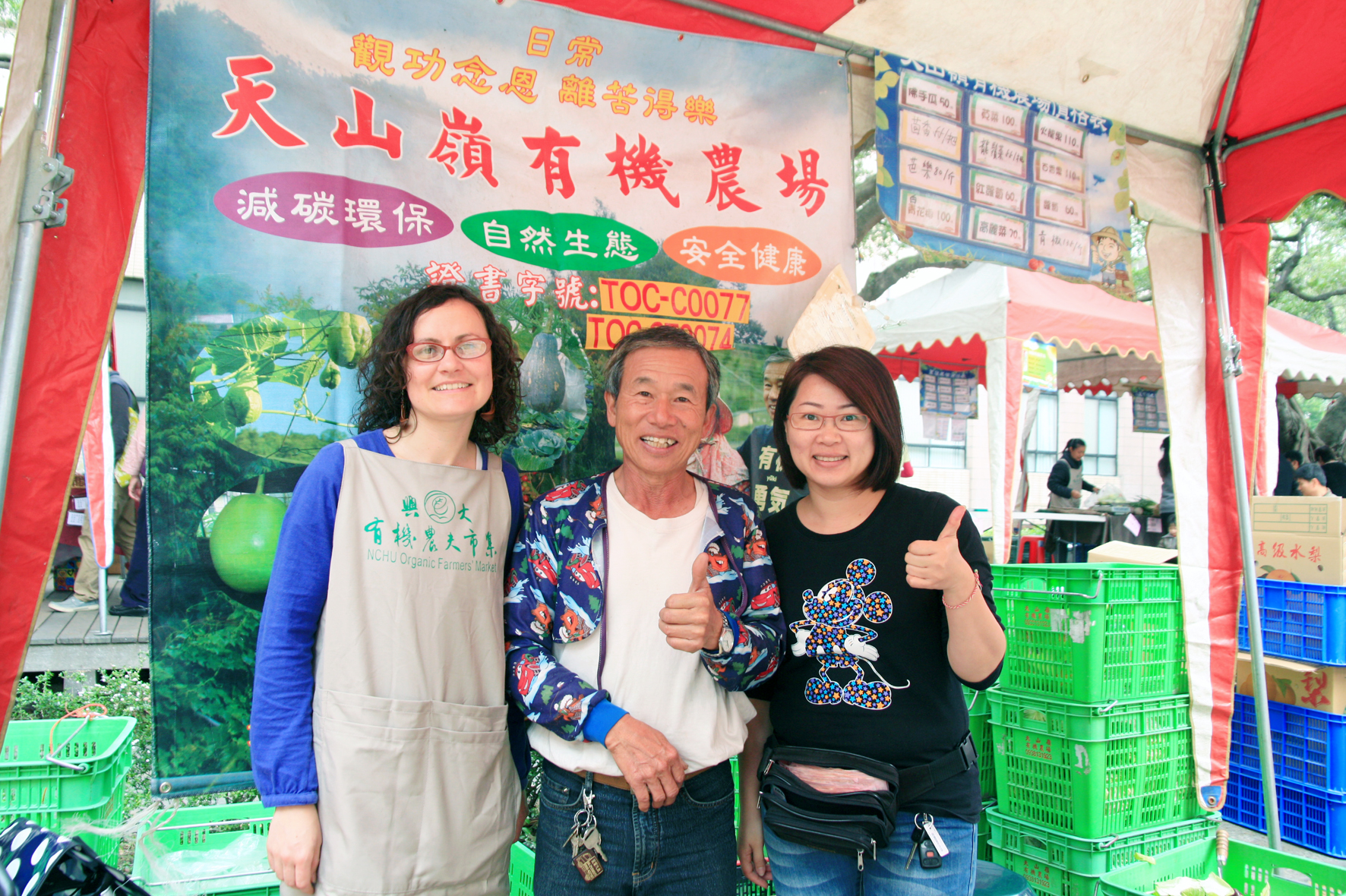 法國志工ELODIE(左)到天山嶺有機農場進行農事體驗,農場老闆黃添來(中)帶著志工到興大農夫市集上工,體會與消費者互動的快樂。