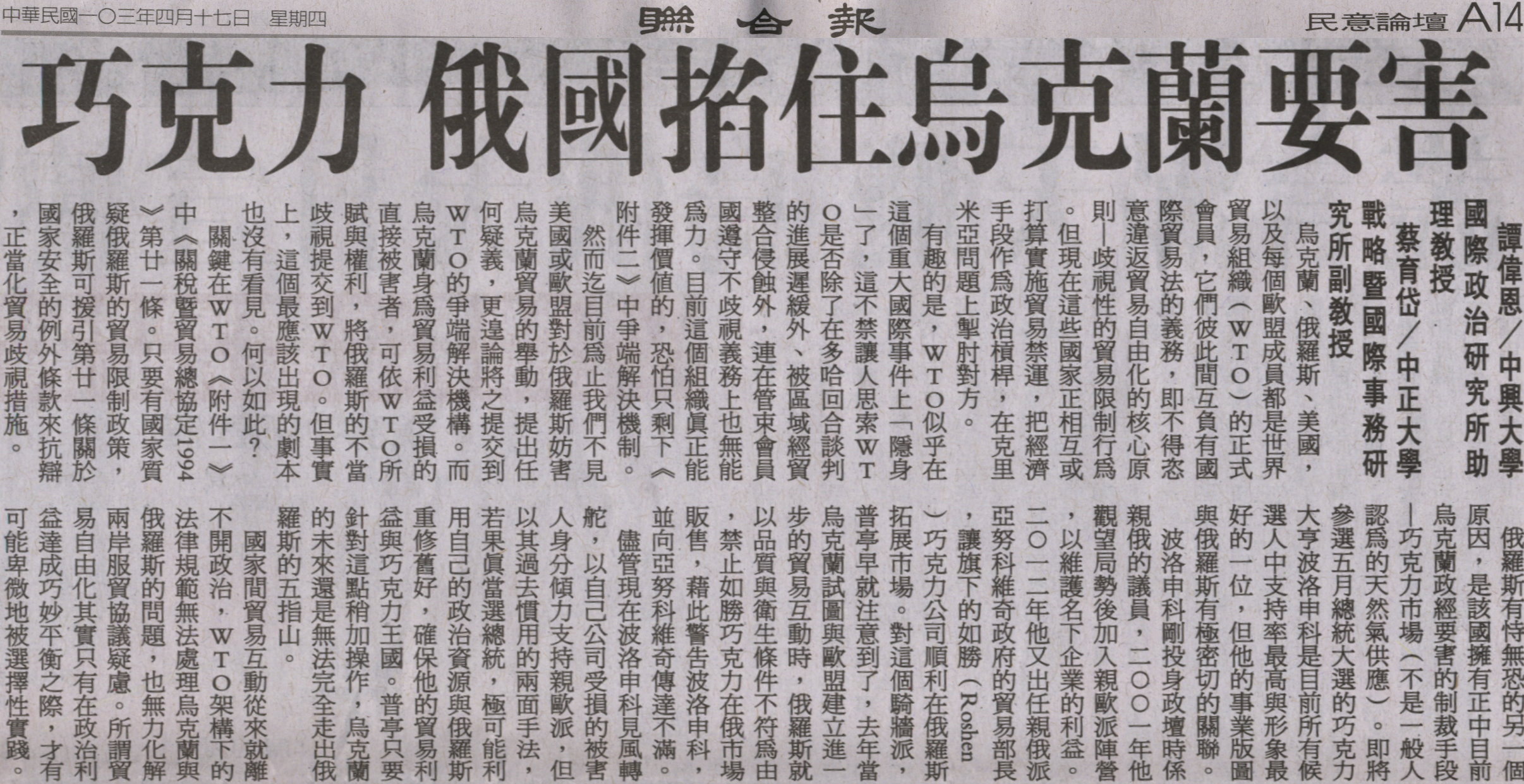 稿源:2014-04-17/聯合報/譚偉恩 蔡育岱/A16版/民意論壇
