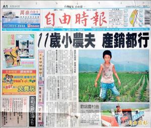台東專科學校高職部農機科三年級學生彭蘇志浩對於農機操作維修技術一流,獲保送國立中興大學。(記者黃明堂攝) 2006年8月19日的自由時報頭版「11歲小農夫 產銷都行」,報導彭思浩小小年紀,擅長農作;如今的他改名彭蘇志浩,依舊熱愛種稻田。(記者黃明堂攝) |
