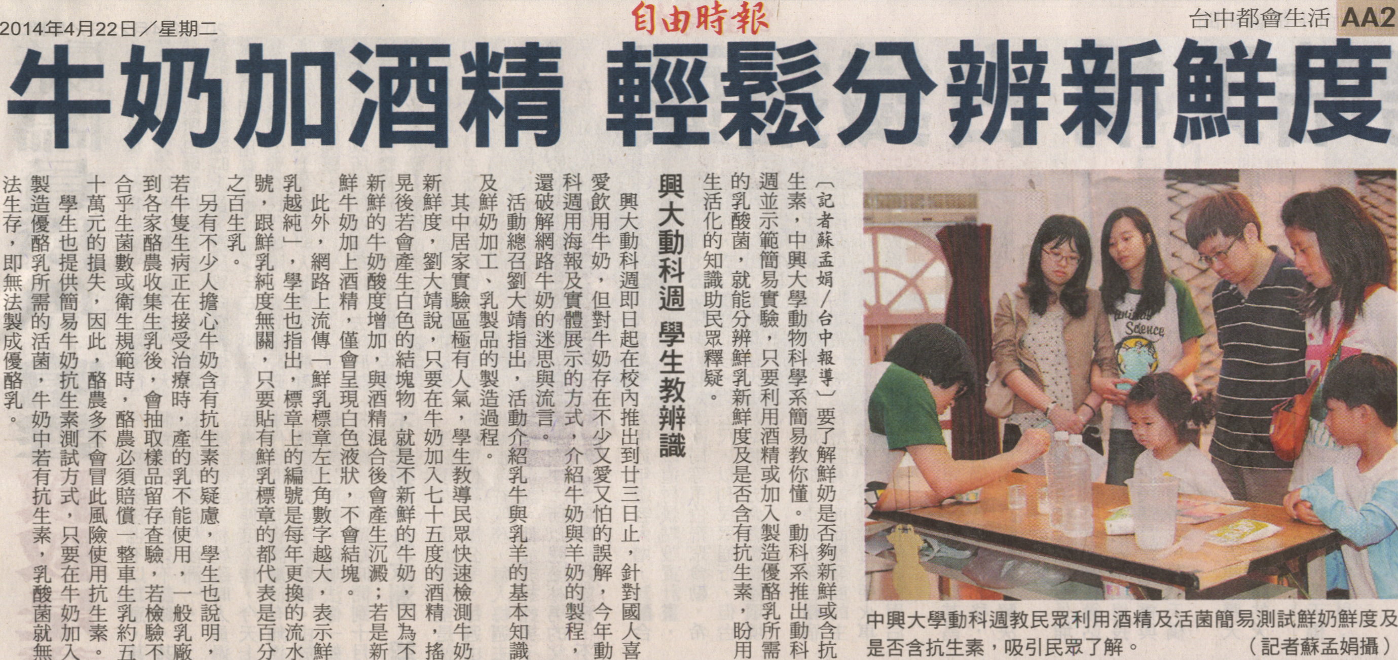要了解鮮奶是否夠新鮮或含抗生素,中興大學動物科學系簡易教你懂。動科系推出動科週並示範簡易實驗,只要利用酒精或加入製造優酪乳所需的乳酸菌,就能分辨鮮乳新鮮度及是否含有抗生素,盼用生活化的知識助民眾釋疑。
