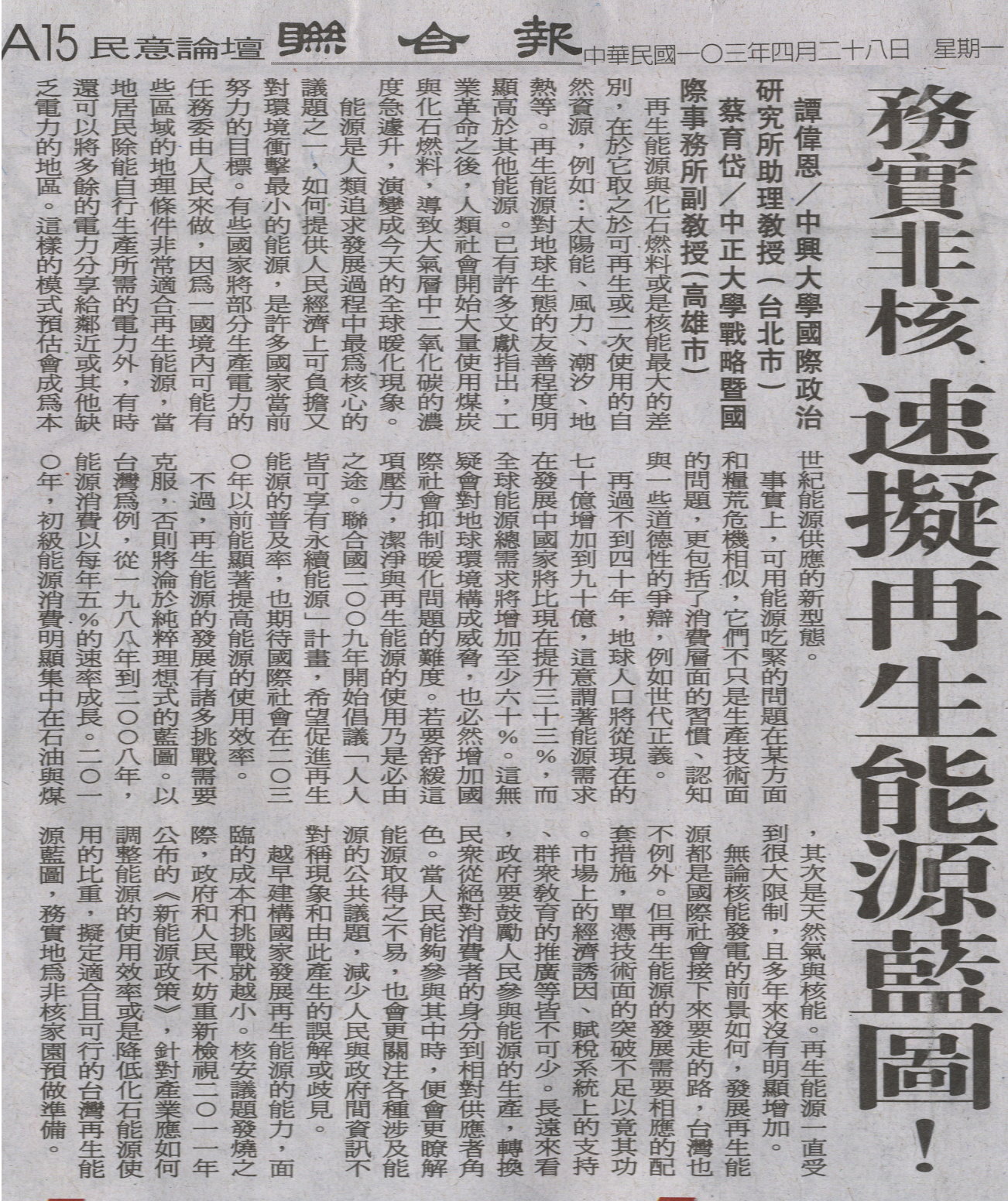 稿源:2014-04-28/聯合報/A15/民意論壇/譚偉恩、蔡育岱