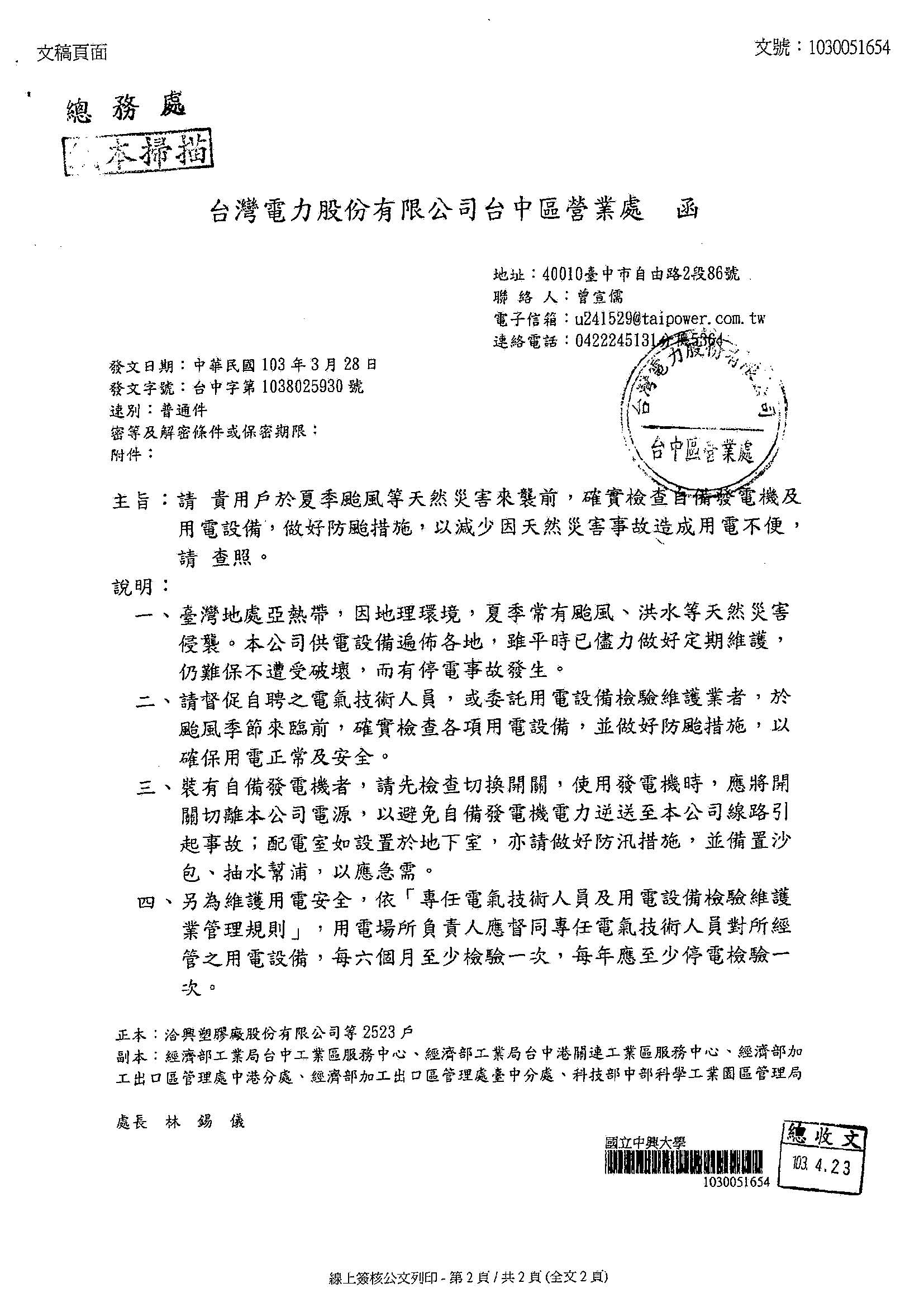 - 相關附件 1030051654 請 貴用戶於夏季颱風等天然災害來襲前,確實檢查自備發電機及用電設備,做好防颱措施,以減少因天然災害事故造成用電不便,請 查照。_頁面_2.jpg