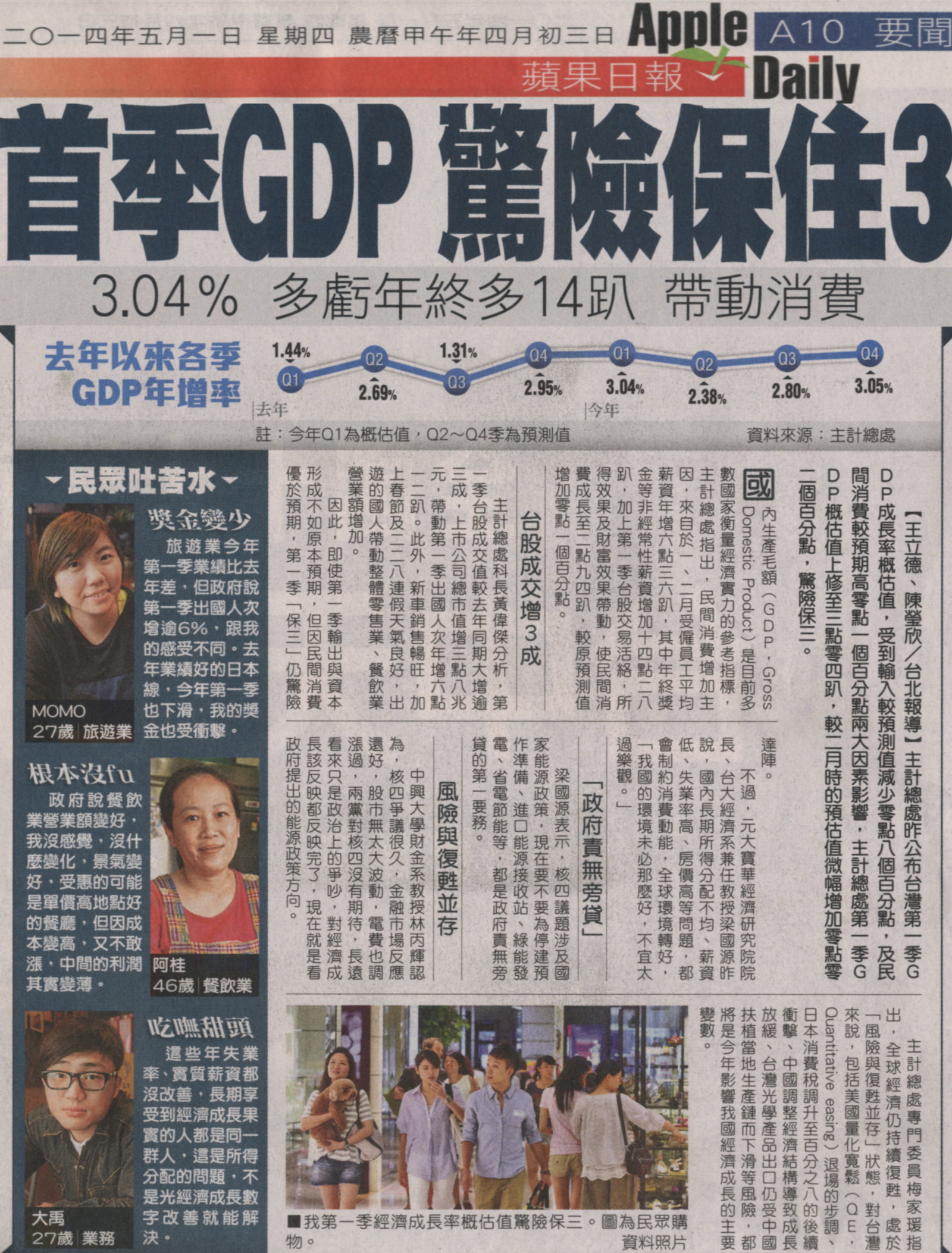 主計總處昨公布台灣第一季GDP成長率概估值,受到輸入較預測值減少零點八個百分點,及民間消費較預期高零點一個百分點兩大因素影響,主計總處第一季GDP概估值上修至三點零四趴,較二月時的預估值微幅增加零點零二個百分點,驚險保三。