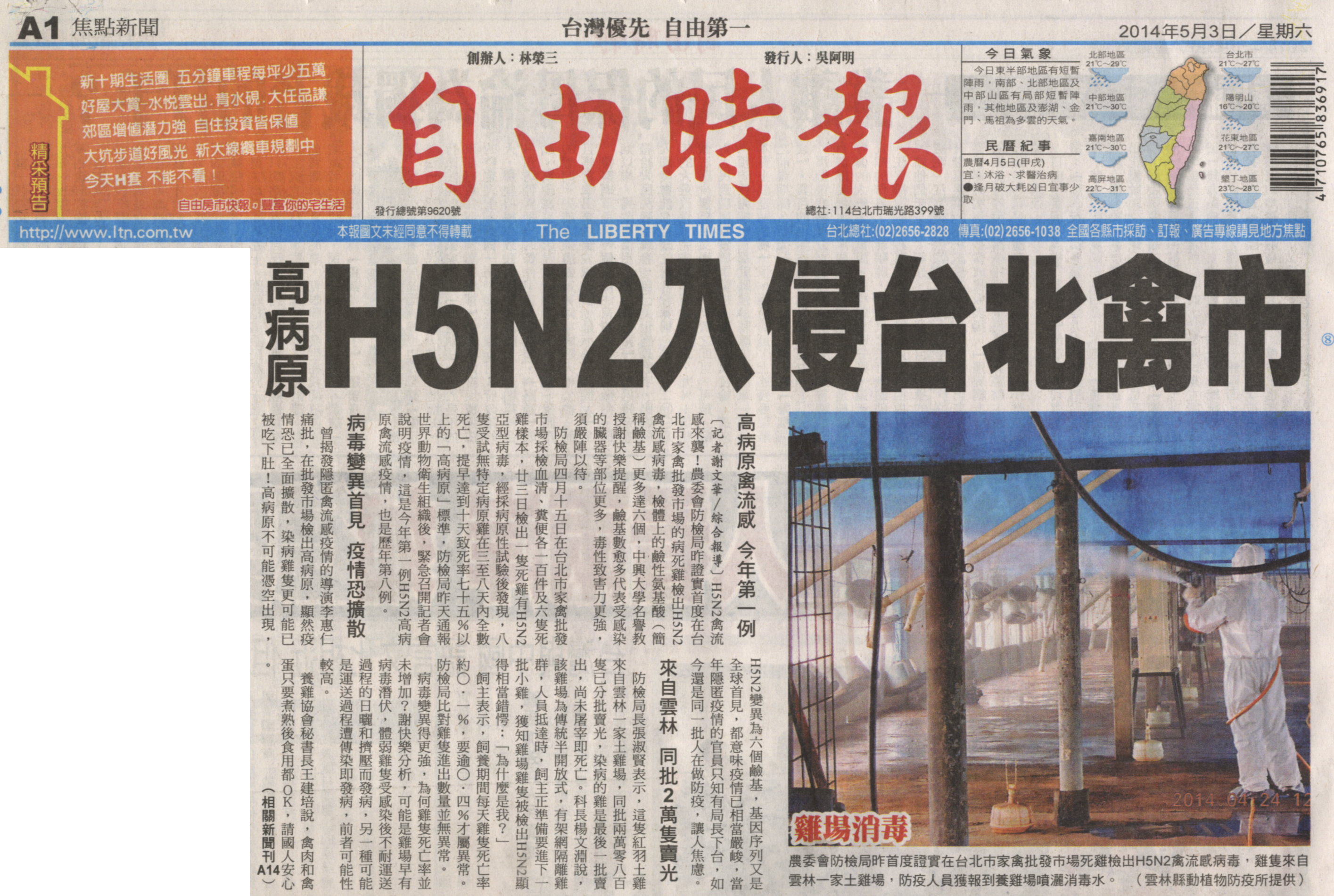 防檢局四月十五日在台北市家禽批發市場採檢血清、糞便各一百件及六隻死雞樣本,廿三日檢出一隻死雞有H5N2亞型病毒,經採病原性試驗後發現,八隻受試無特定病原雞在三至八天內全數死亡,提早達到十天致死率七十五%以上的「高病原」標準,防檢局昨天通報世界動物衛生組織後,緊急召開記者會說明疫情,這是今年第一例H5N2高病原禽流感疫情,也是歷年第八例。