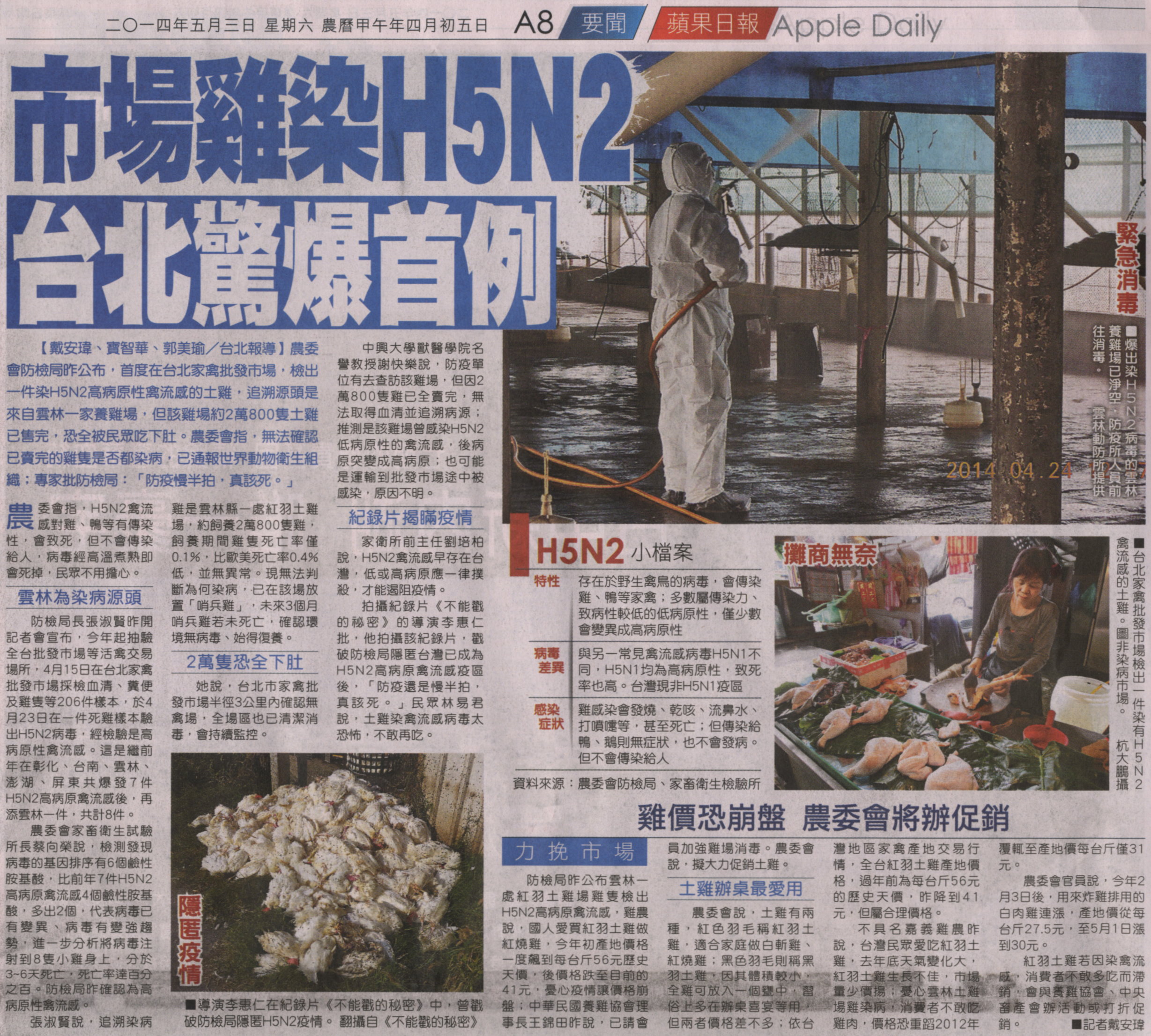 防檢局長張淑賢昨開記者會宣布,今年起抽驗全台批發市場等活禽交易場所,4月15日在台北家禽批發市場採檢血清、糞便及雞隻等206件樣本,於4月23日在一件死雞樣本驗出H5N2病毒,經檢驗是高病原性禽流感。這是繼前年在彰化、台南、雲林、澎湖、屏東共爆發7件H5N2高病原禽流感後,再添雲林一件,共計8件。