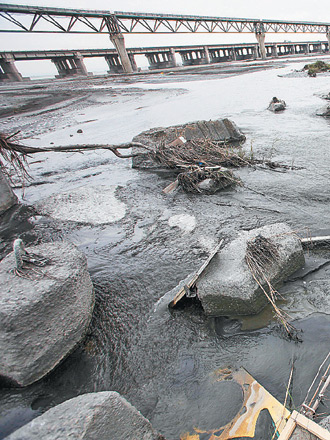 中沙大橋的河床中間處,因水流較大,河沙沖 刷潛堰固床工處、蜂巢塊與鼎形塊等設施的痕跡 相當明顯。程宜華/攝影