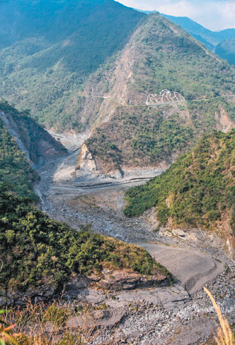 當年莫拉克風災沖毀霧台唯一聯外橋梁,也造成 附近地形大變動,原本的涓涓小溪瞬間變成一整片乾涸的碎石沙地,山坡地至今仍有崩塌痕跡。程宜華/攝影