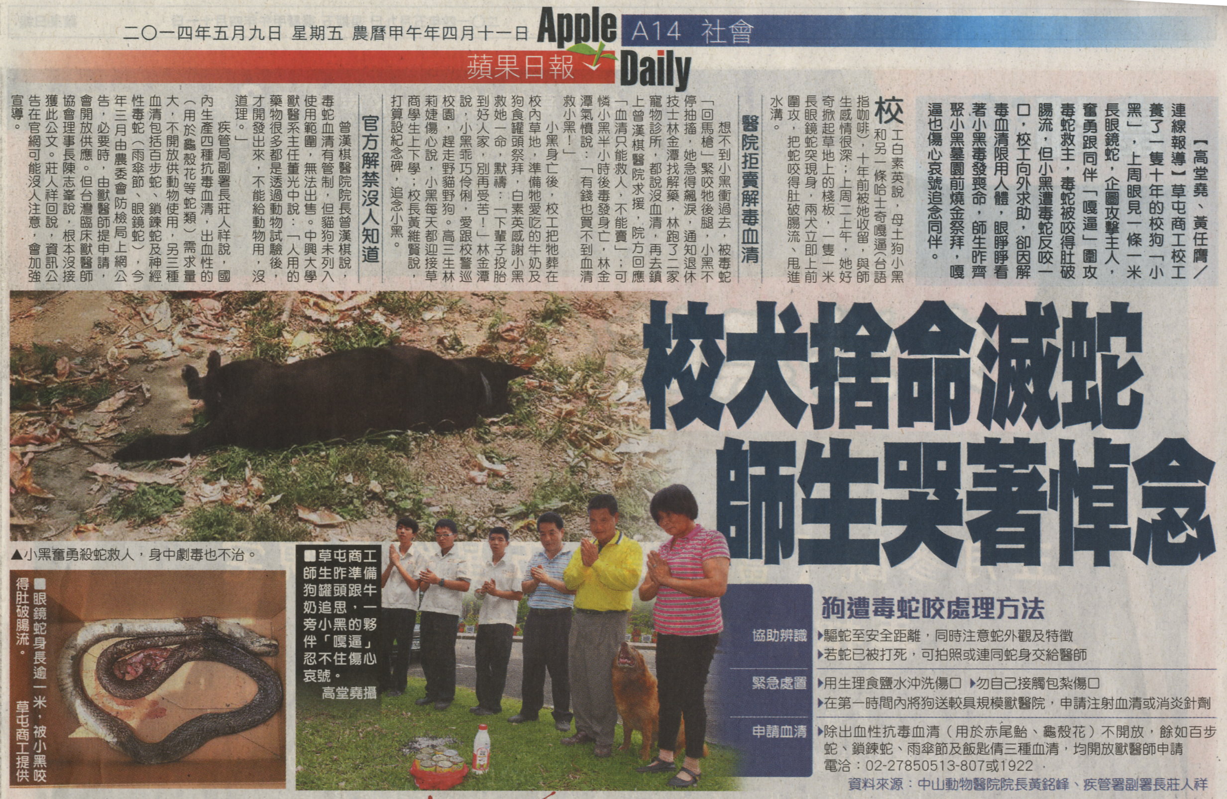 草屯商工校工養了一隻十年的校狗「小黑」,上周眼見一條一米長眼鏡蛇,企圖攻擊主人,奮勇跟同伴「嘎逼」圍攻毒蛇救主,毒蛇被咬得肚破腸流,但小黑遭毒蛇反咬一口,校工向外求助,卻因解毒血清限用人體,眼睜睜看著小黑毒發喪命,師生昨齊聚小黑墓園前燒金祭拜,嘎逼也傷心哀號追念同伴。