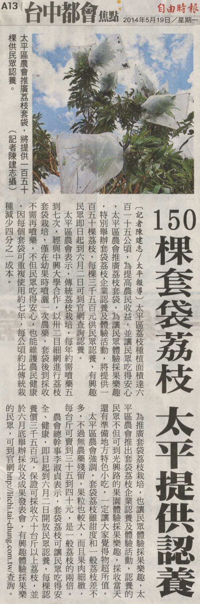 太平區荔枝種植面積達六百一十五公頃,為提高農民收益,並讓民眾吃得安心,太平區農會推廣荔枝套袋,為讓民眾體驗採果樂趣,特別舉辦套袋荔枝企業認養及體驗活動,將提供一百五十棵荔枝,每棵三千五百元供民眾認養,有興趣民眾即日起到六月二日可到官網查詢認養。