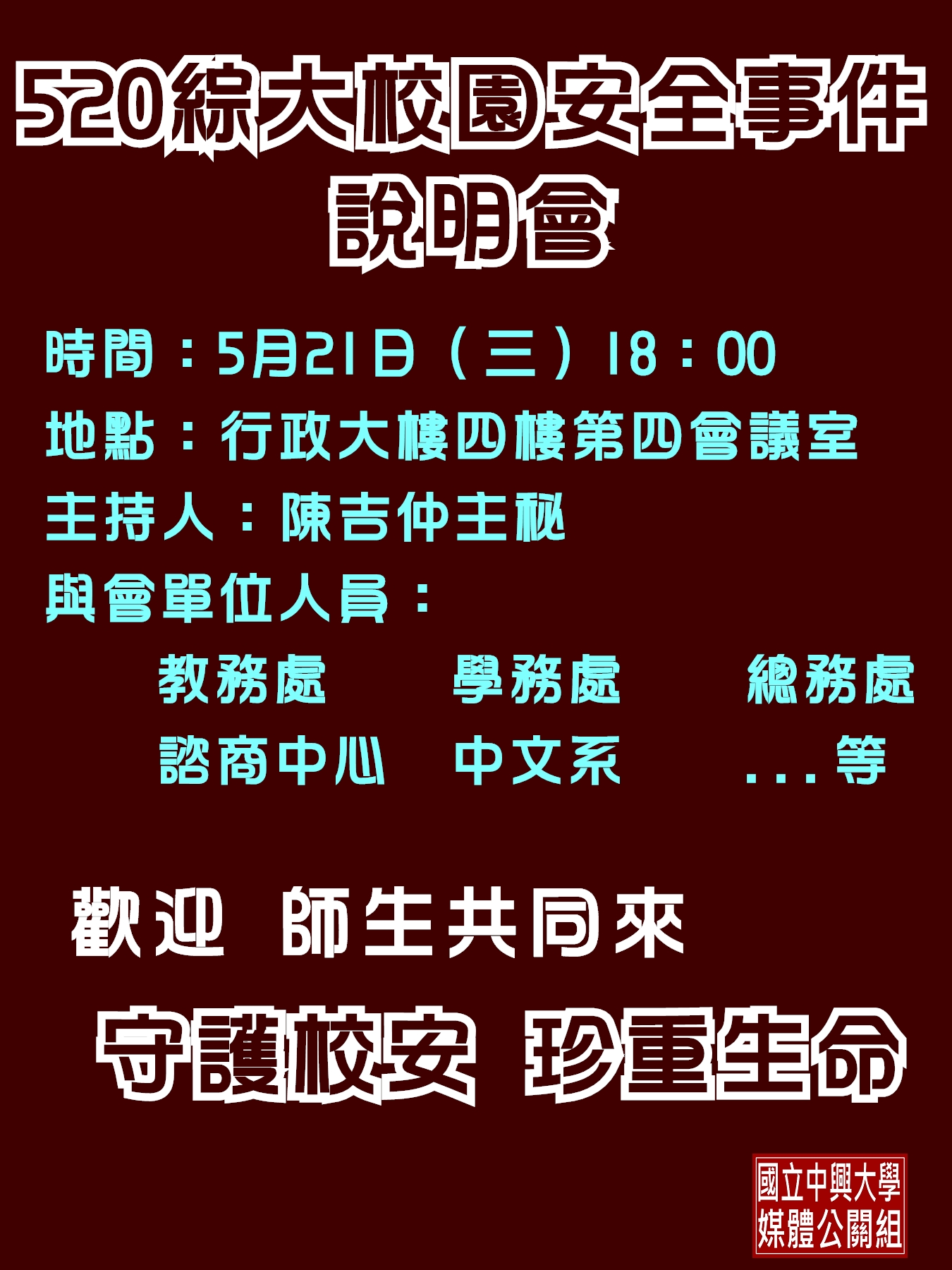 【通告】520綜大校園安全事件說明會5/21(三)18:00行政大樓四樓舉行