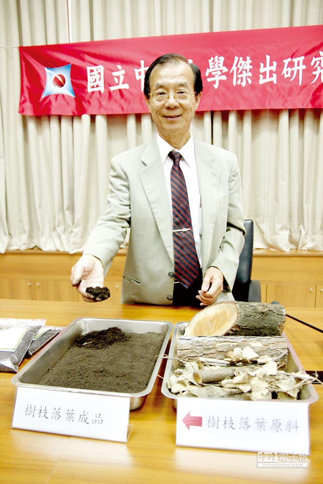 興大土壤環境科學系楊秋忠教授研發快速處理技術,將校園枯枝落葉變成有機質肥料「大勇肥」。圖/中興大學提供