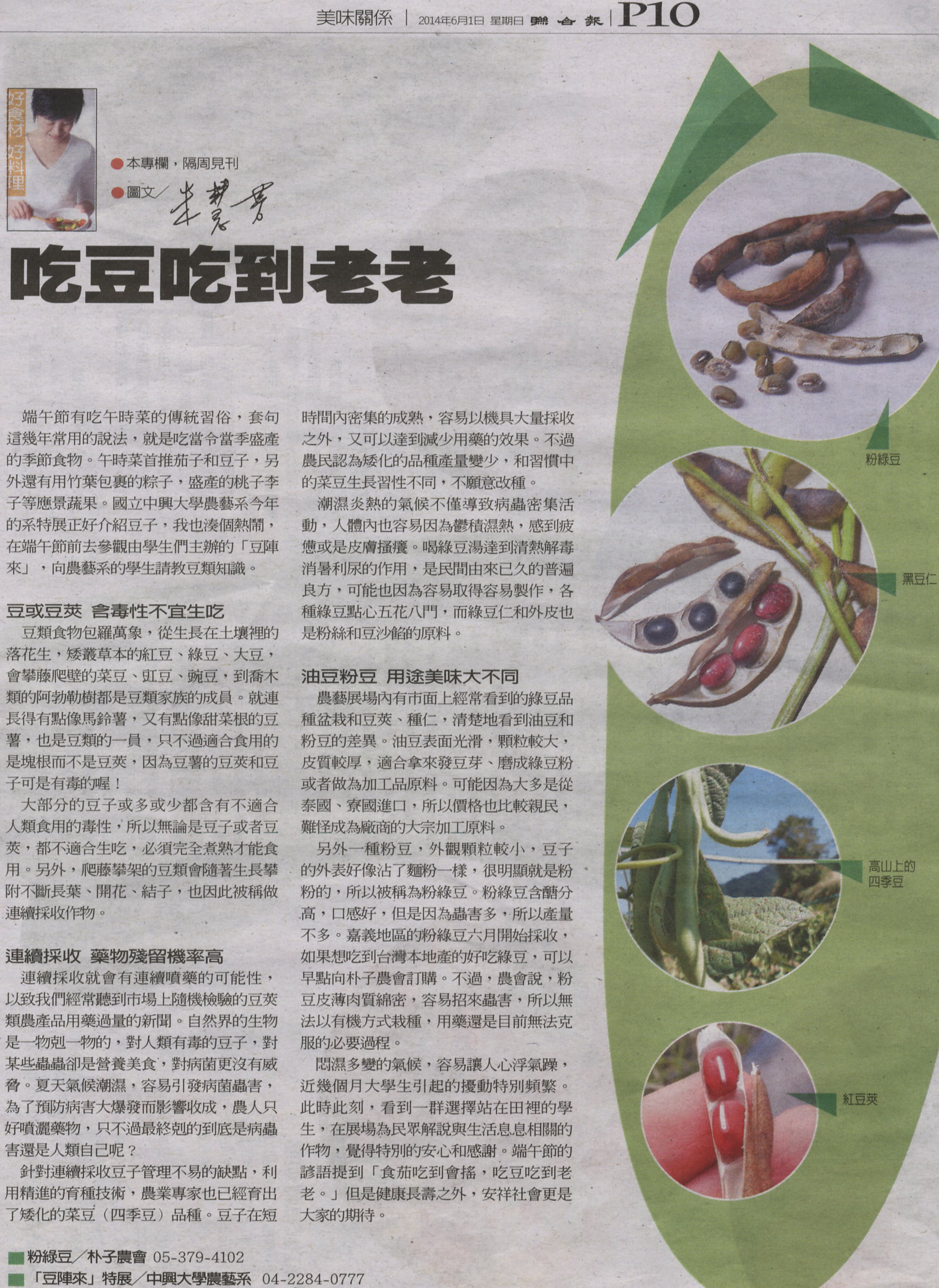 悶濕多變的氣候,容易讓人心浮氣躁,近幾個月大學生引起的擾動特別頻繁。此時此刻,看到一群選擇站在田裡的學生,在展場為民眾解說與生活息息相關的作物,覺得特別的安心和感謝。端午節的諺語提到「食茄吃到會搖,吃豆吃到老老。」但是健康長壽之外,安祥社會更是大家的期待。
