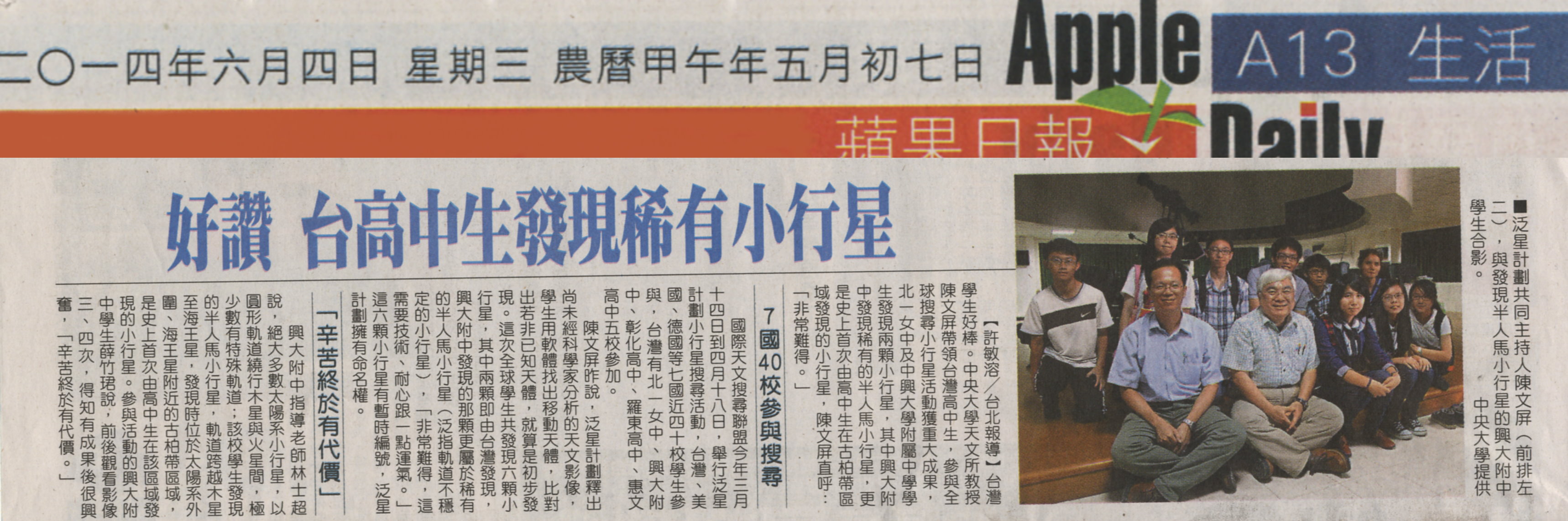 台灣學生好棒。中央大學天文所教授陳文屏帶領台灣高中生,參與全球搜尋小行星活動獲重大成果,北一女中及中興大學附屬中學學生發現兩顆小行星,其中興大附中發現稀有的半人馬小行星,更是史上首次由高中生在古柏帶區域發現的小行星,陳文屏直呼:「非常難得。」