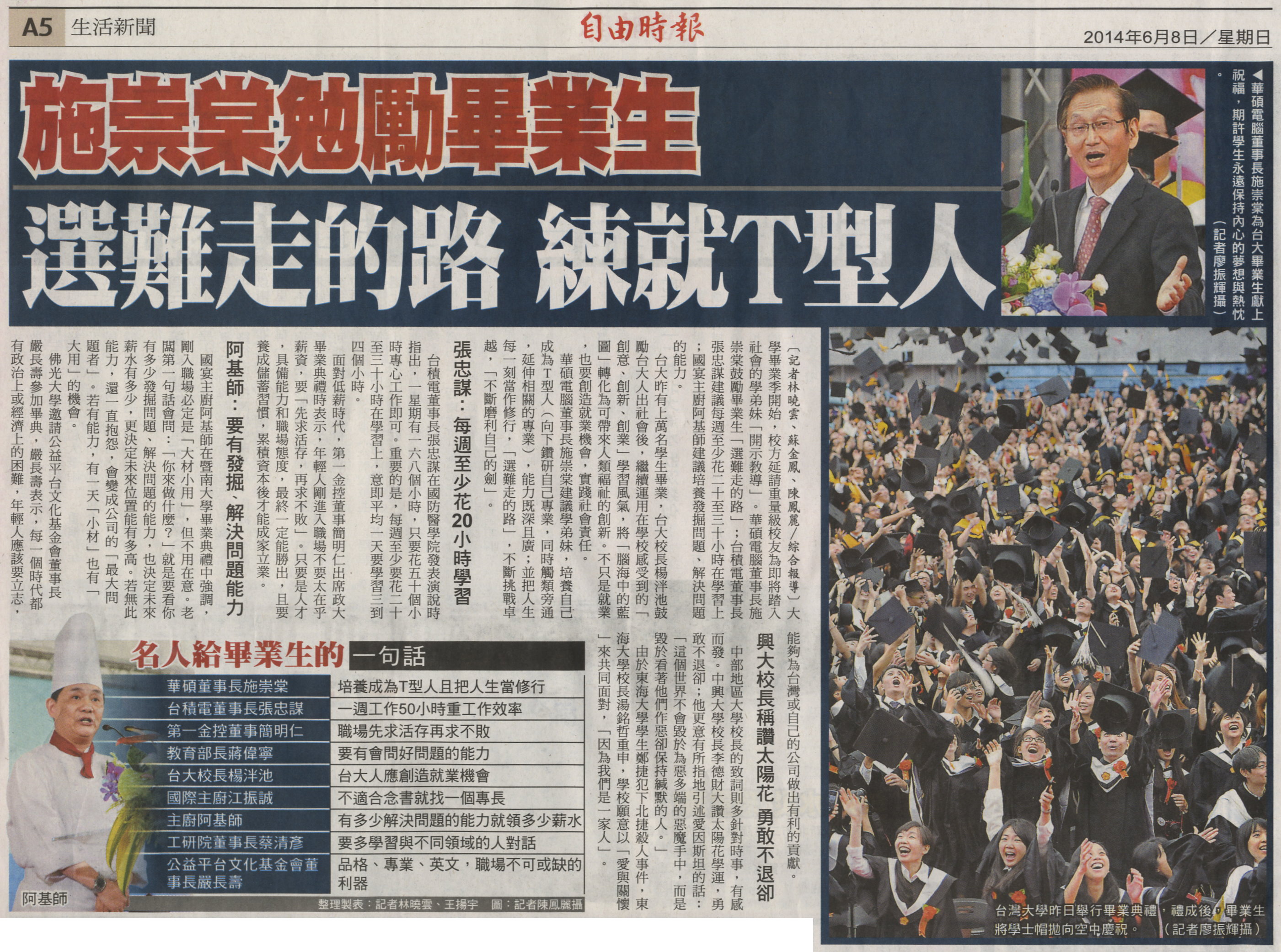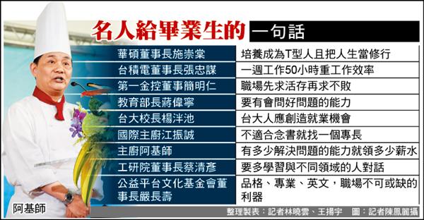 大學畢業季開始,校方延請重量級校友為即將踏入社會的學弟妹「開示教導」。華碩電腦董事長施崇棠鼓勵畢業生「選難走的路」;台積電董事長張忠謀建議每週至少花二十至三十小時在學習上;國宴主廚阿基師建議培養發掘問題、解決問題的能力。