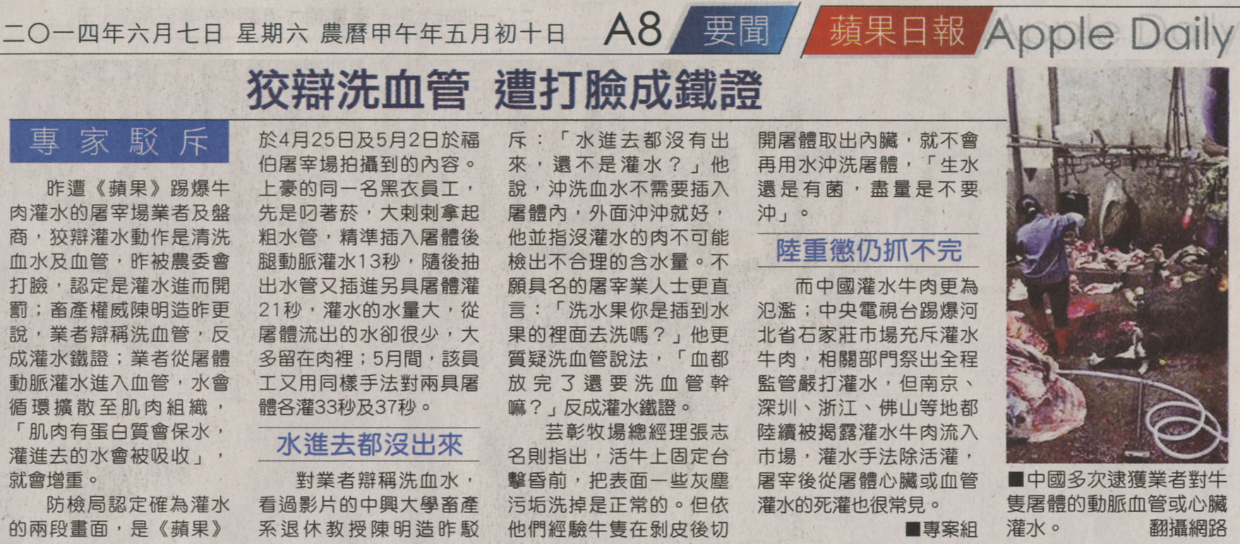 昨遭《蘋果》踢爆牛肉灌水的屠宰場業者及盤商,狡辯灌水動作是清洗血水及血管,昨被農委會打臉,認定是灌水進而開罰;畜產權威陳明造昨更說,業者辯稱洗血管,反成灌水鐵證;業者從屠體動脈灌水進入血管,水會循環擴散至肌肉組織,「肌肉有蛋白質會保水,灌進去的水會被吸收」,就會增重。