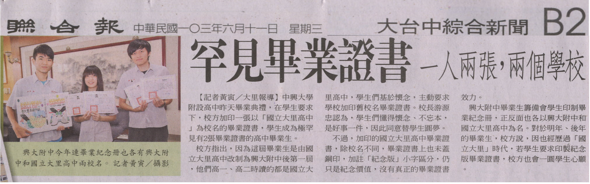 【媒體報導】罕見畢業證書 一人兩張,兩個學校