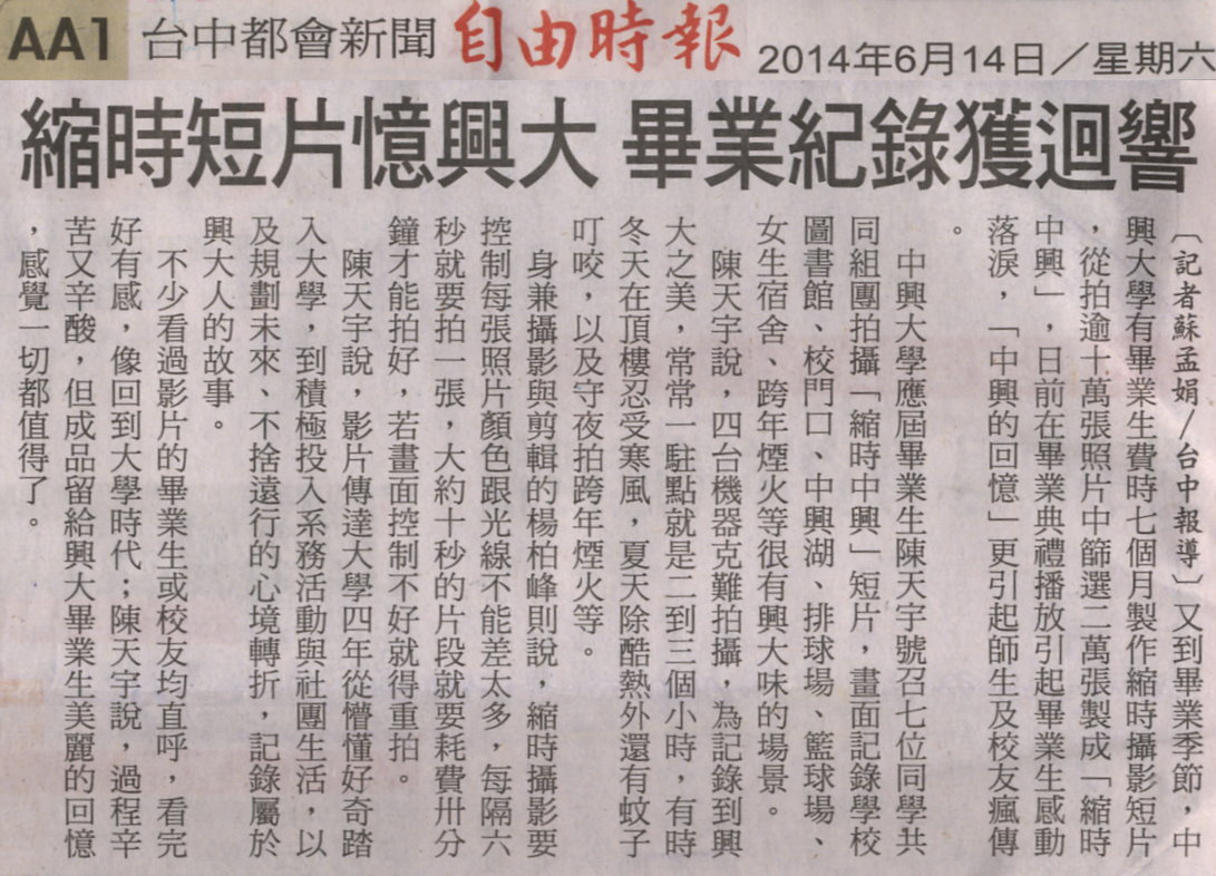 【媒體報導】自製縮時攝影紀錄興大之美 畢業生感動破表
