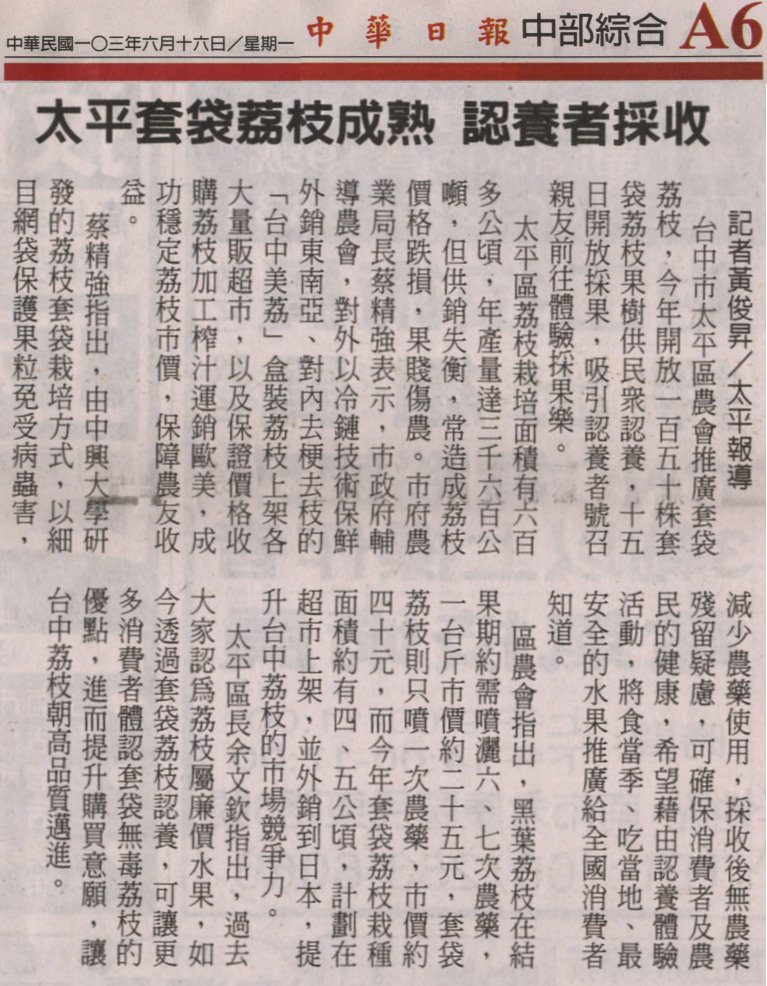 【媒體報導】太平套袋荔枝成熟 認養者採收
