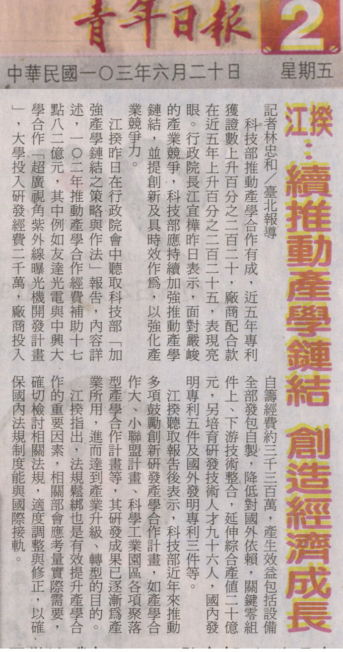 【媒體報導】江揆:續推動產學鏈結 創造經濟成長