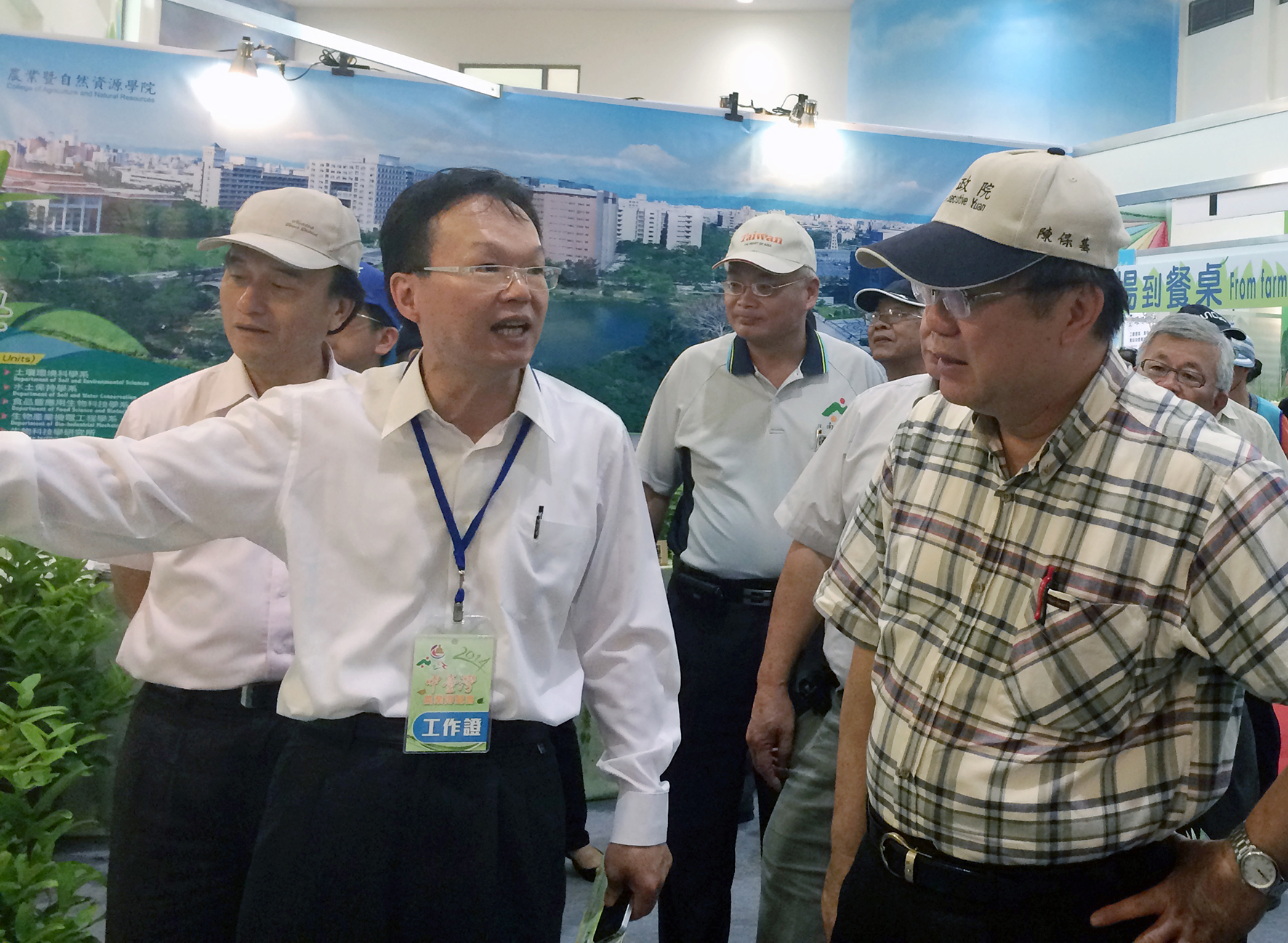 農委會陳保基主委(右)到興大攤位參觀,由興大農資學院陳樹群院長(左)導覽解說。