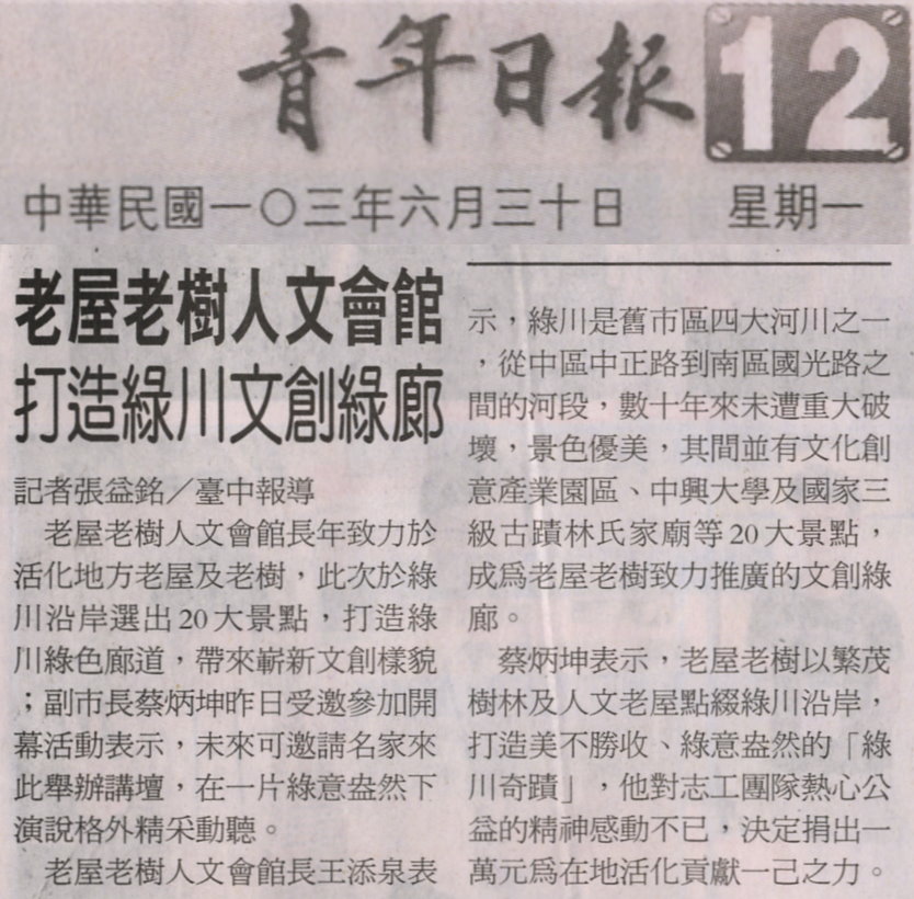 【媒體報導】老屋老樹人文會館 打造綠川文創綠廊