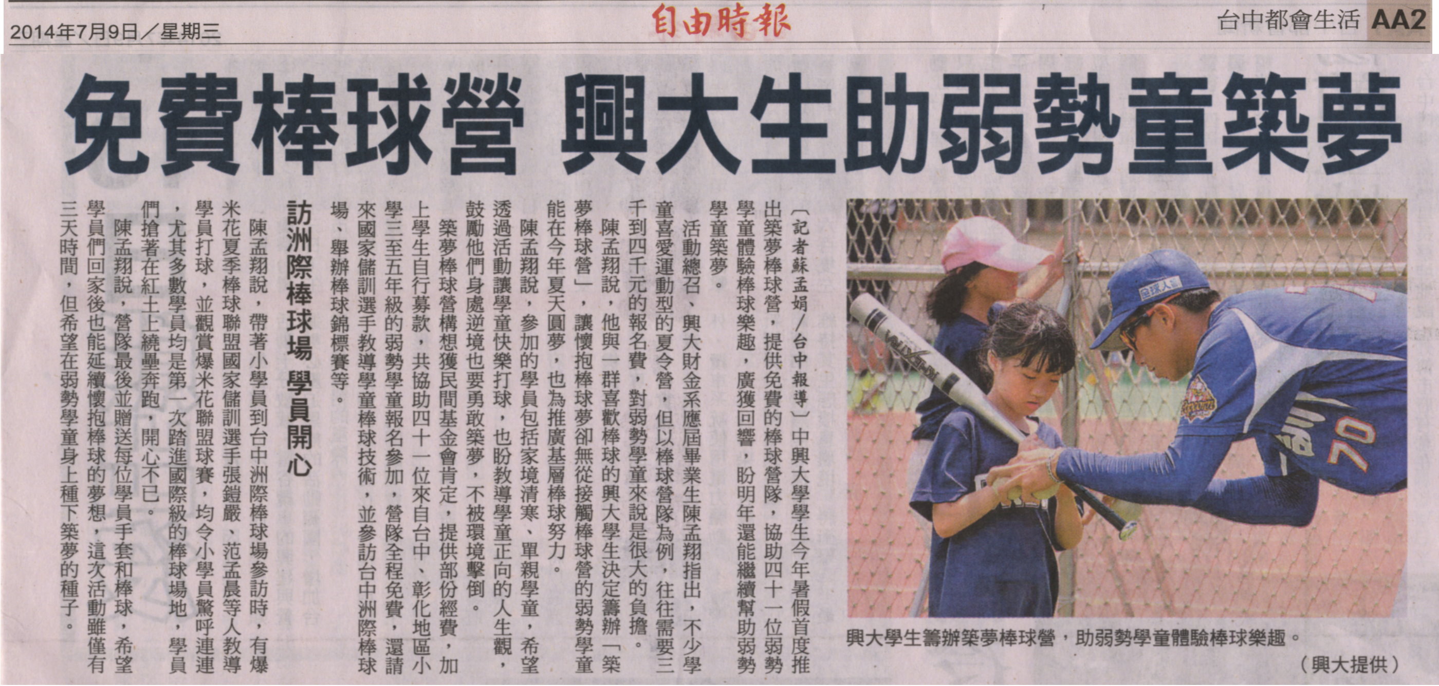 中興大學學生今年暑假首度推出築夢棒球營,提供免費的棒球營隊,協助四十一位弱勢學童體驗棒球樂趣,廣獲回響,盼明年還能繼續幫助弱勢學童築夢。